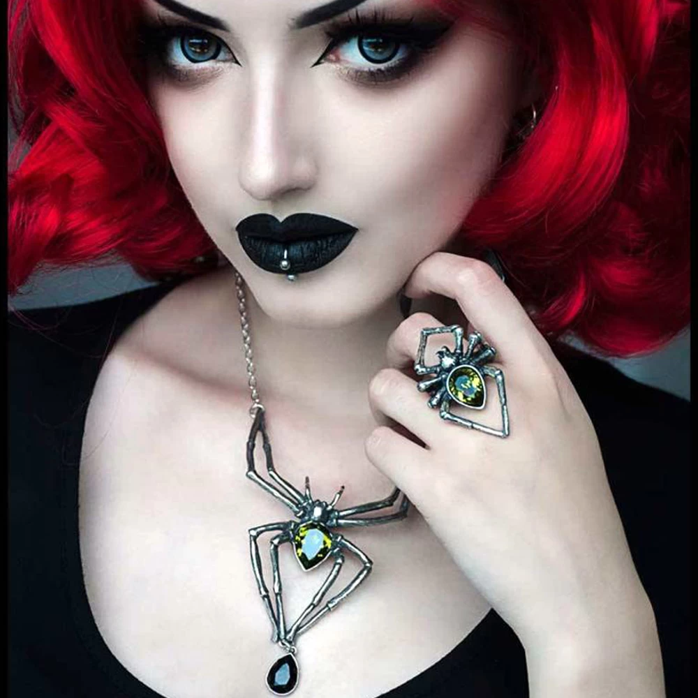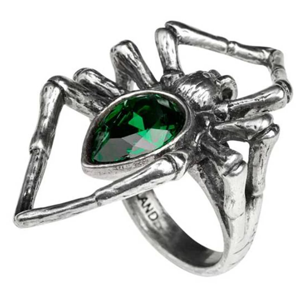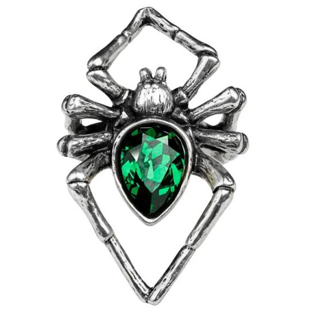 ⹠Une araignée géante, une bague en étain poli avec un grand corps en cristal Swarovski vert émeraude.
