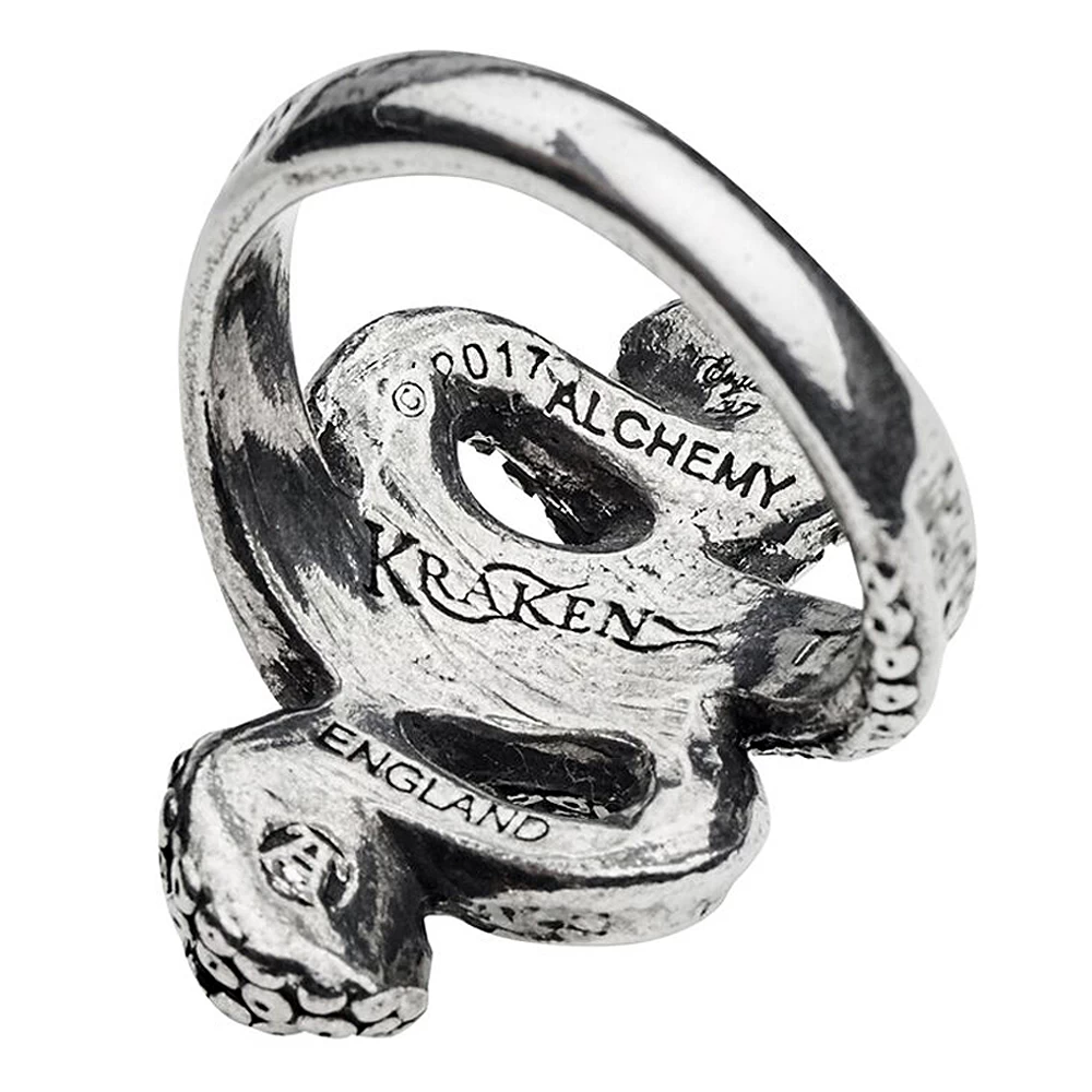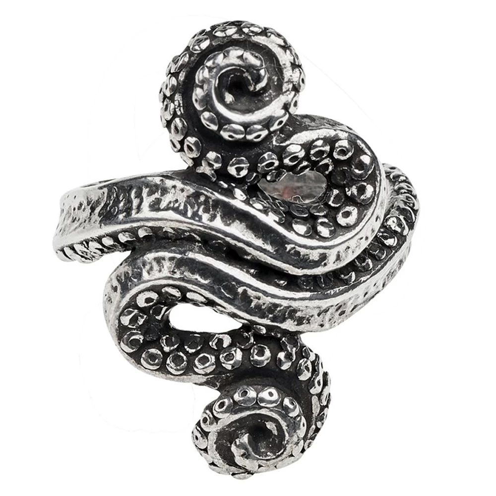 • Bague en étain poli et vieilli représentant les tentacules d’un calmar géant qui s’enroulent autour du doigt.