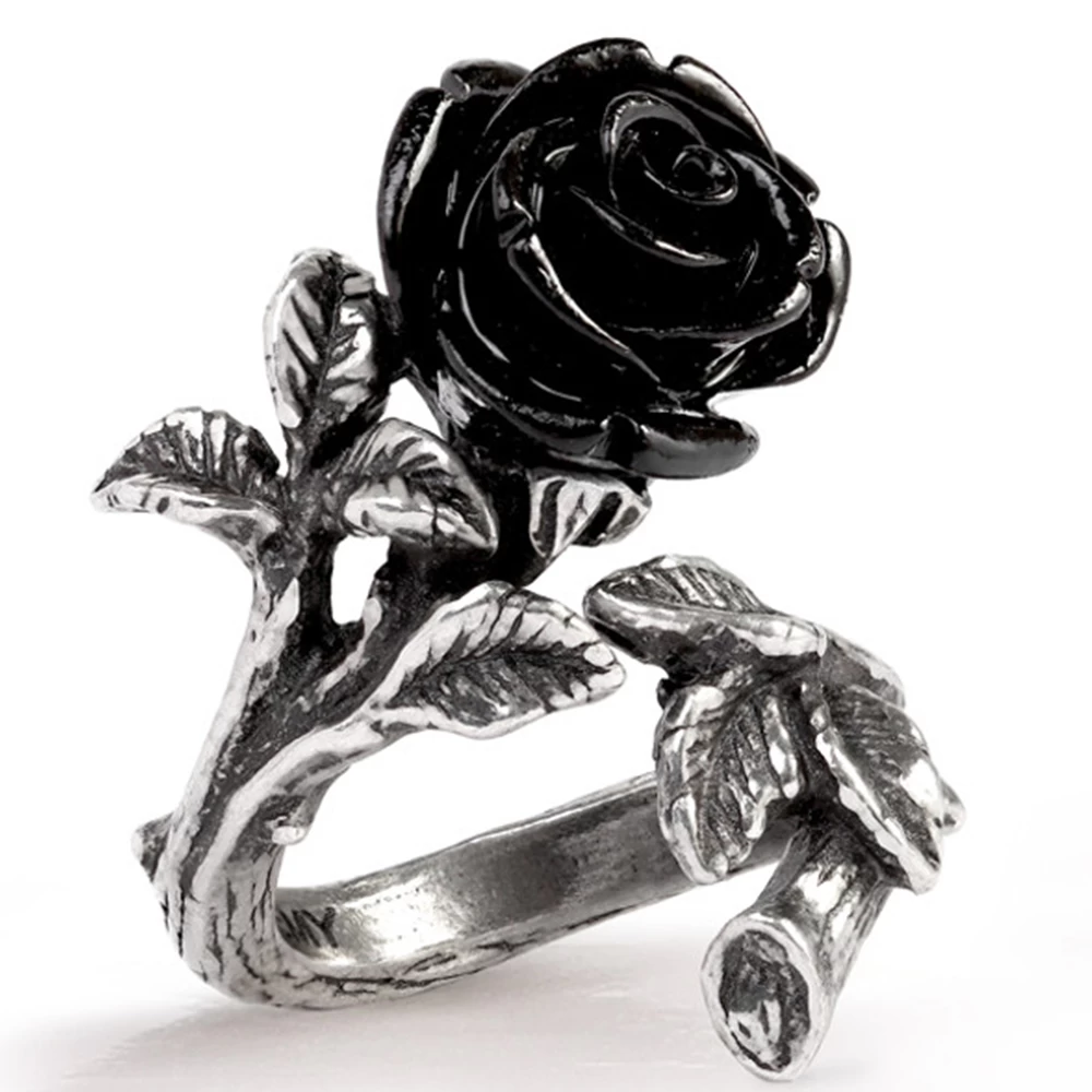 âą Une ficelle en Ă©tain poli de roses sauvages s’enroule autour de votre doigt, mettant en vedette une rose noire en acrylique.
