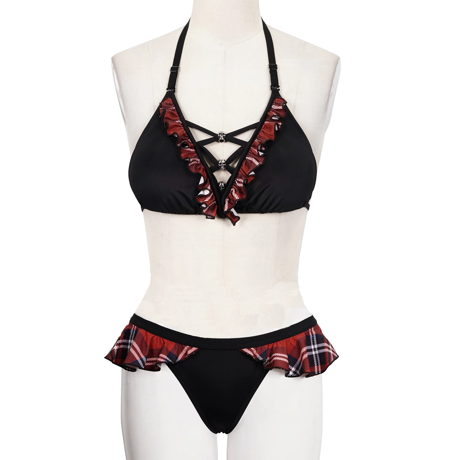 • Bordures à volants sur le devant en tissu écossais rouge à carreaux