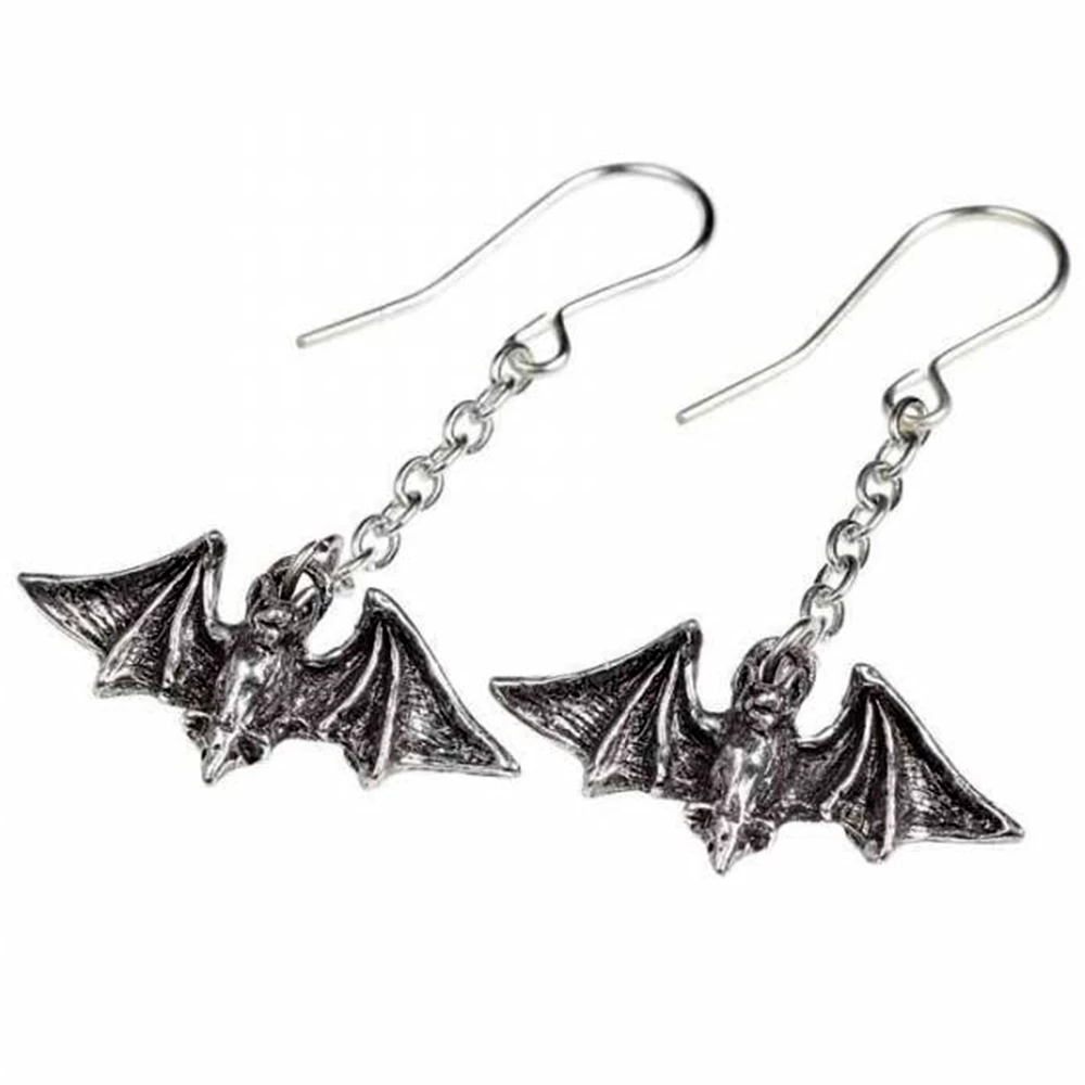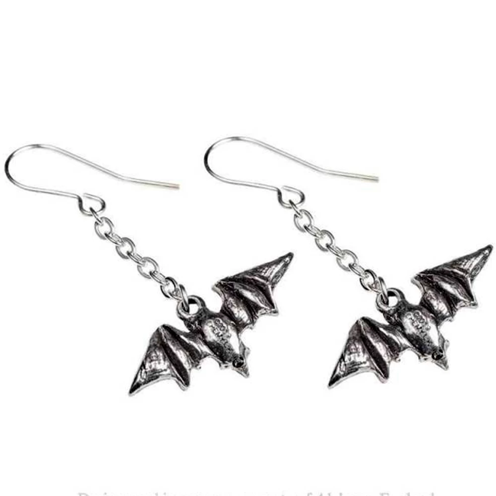 • Une petite paire de chauve-souris volantes, boucles d’oreilles compte-gouttes en étain suspendues à une fine chaîne.