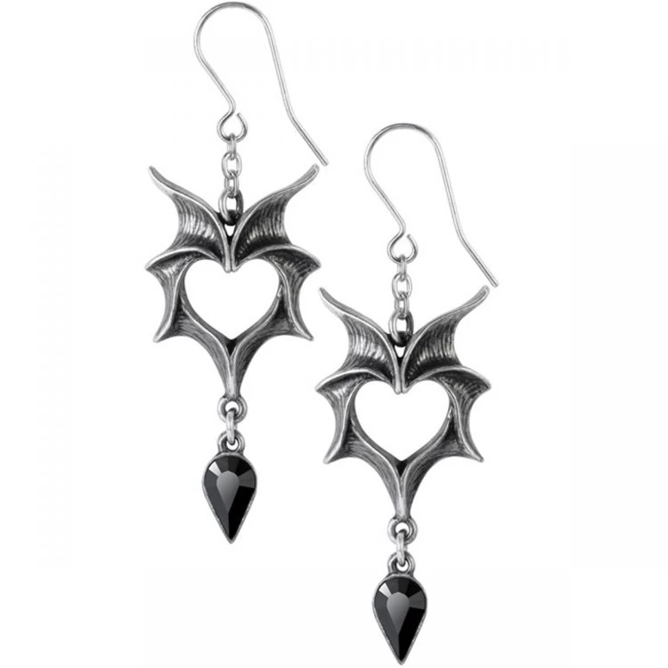 • Une paire de boucles d’oreilles en forme d’ailes de chauve-souris stylisées formant un espace ouvert en forme de cœur au centre, et avec un petit compte-gouttes en cristal autrichien en dessous ; sur chaîne courte et fils d’oreille en acier chirurgical.