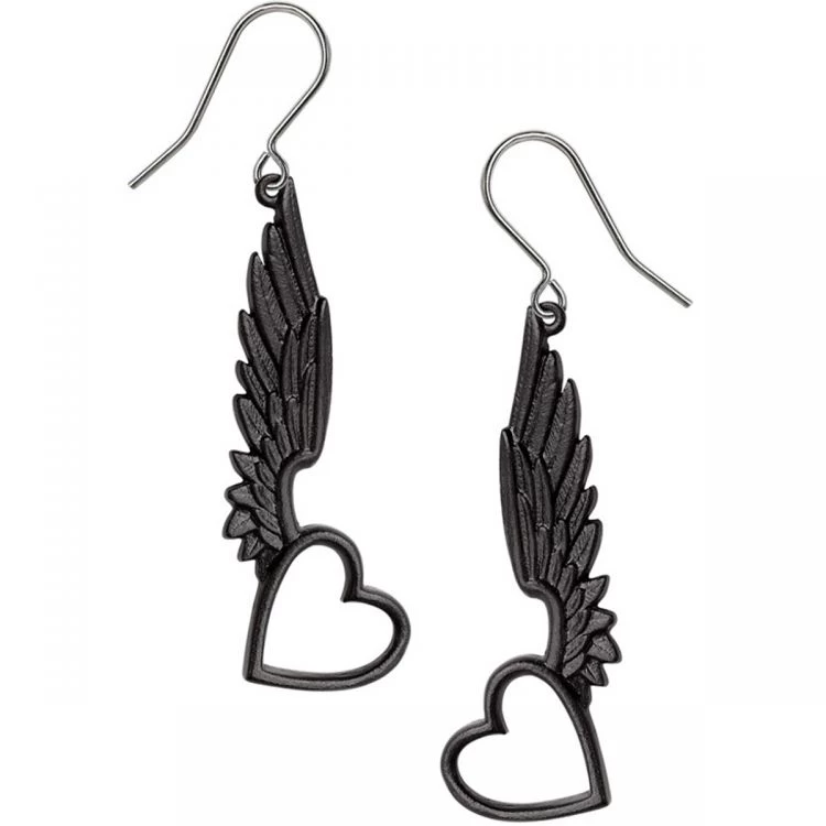 âą Deux boucles d’oreilles en Ă©tain noir de cĆurs ailĂ©s symĂ©triquement opposĂ©s sur crochets en acier chirurgical.