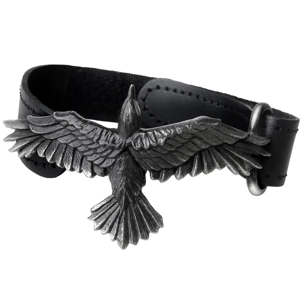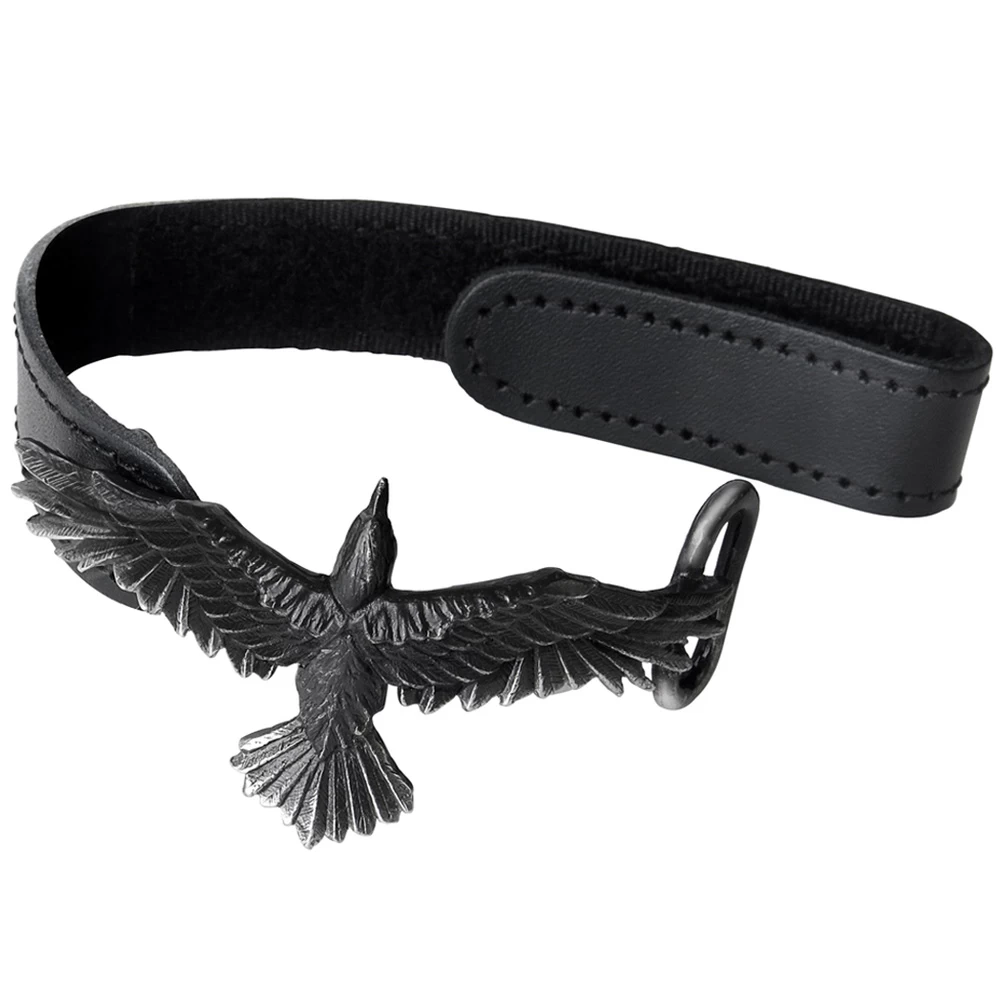 • Un bracelet étroit en cuir noir avec une fermeture à ajustement Velcro, soutenant un corbeau en étain noir avec des plumes de bord de fuite surlignées.