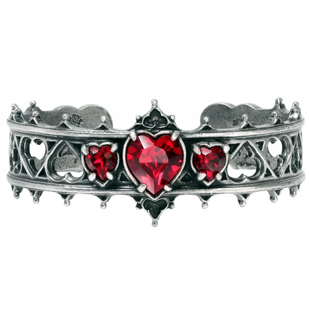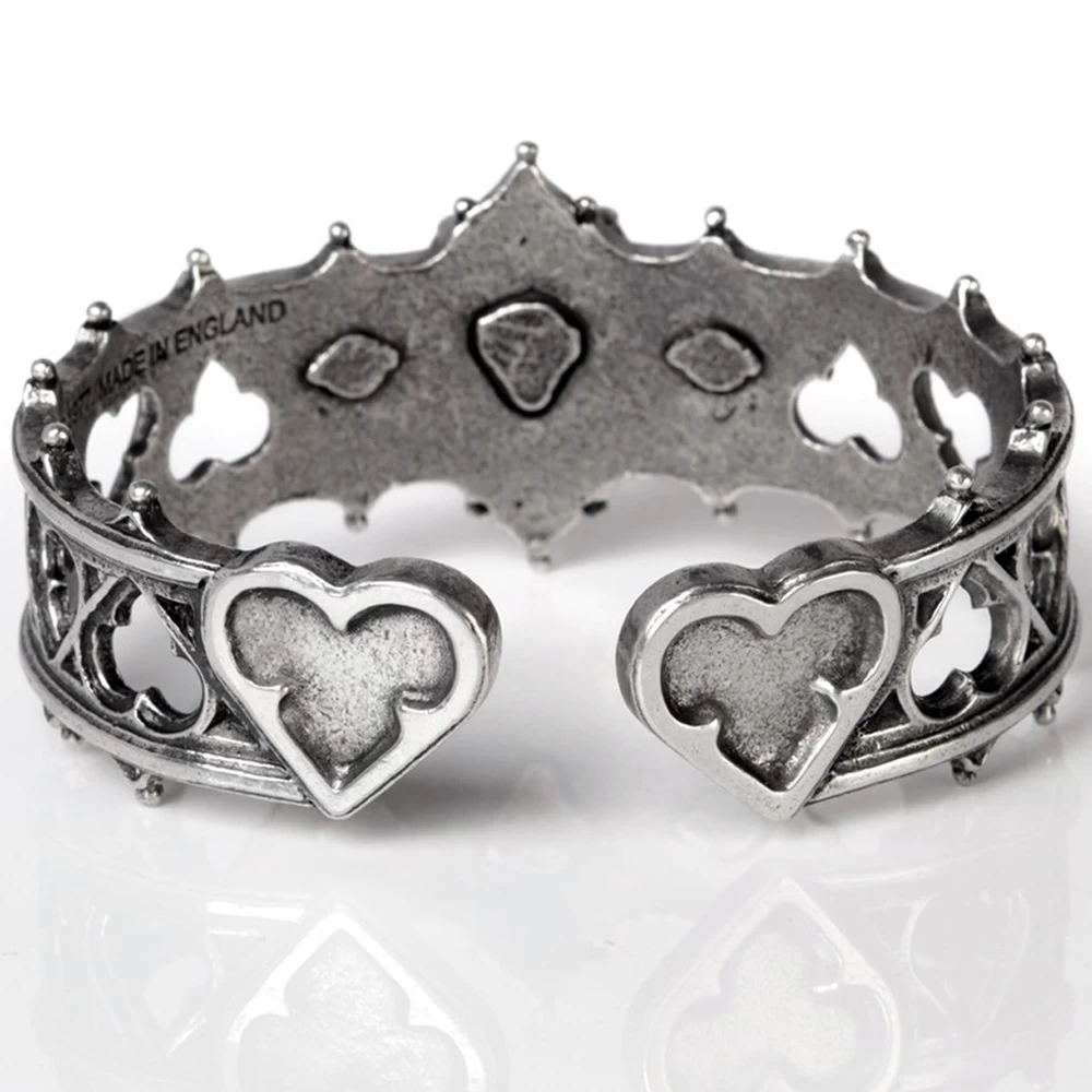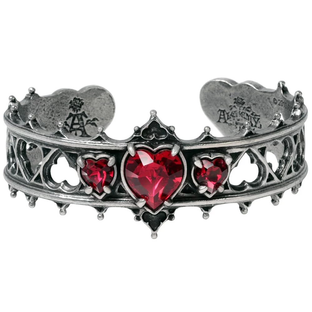 Un bracelet en Ă©tain Ă motif de cĆurs Ă©lisabĂ©thains percĂ©s, serti de trois cĆurs en cristal Swarovski en amĂ©thyste.