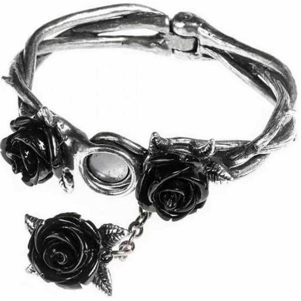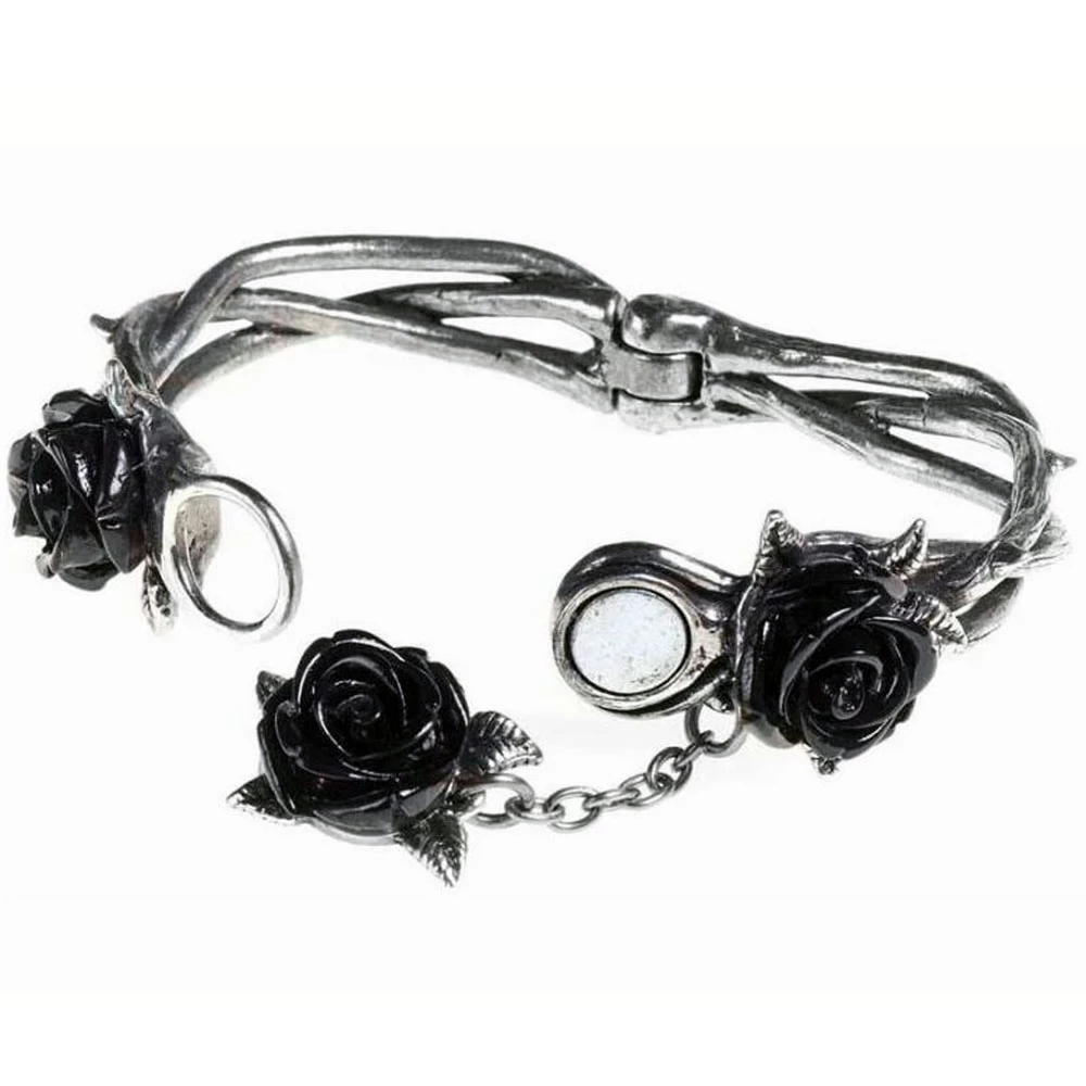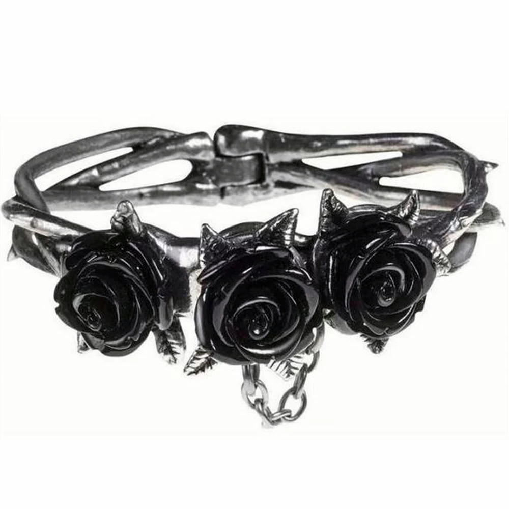 • Un bracelet à charnière en étain, épine de rose torsadée avec trois roses en résine noire sur le devant.