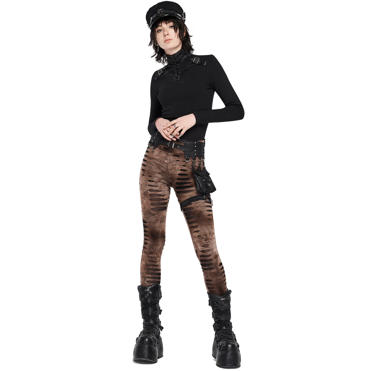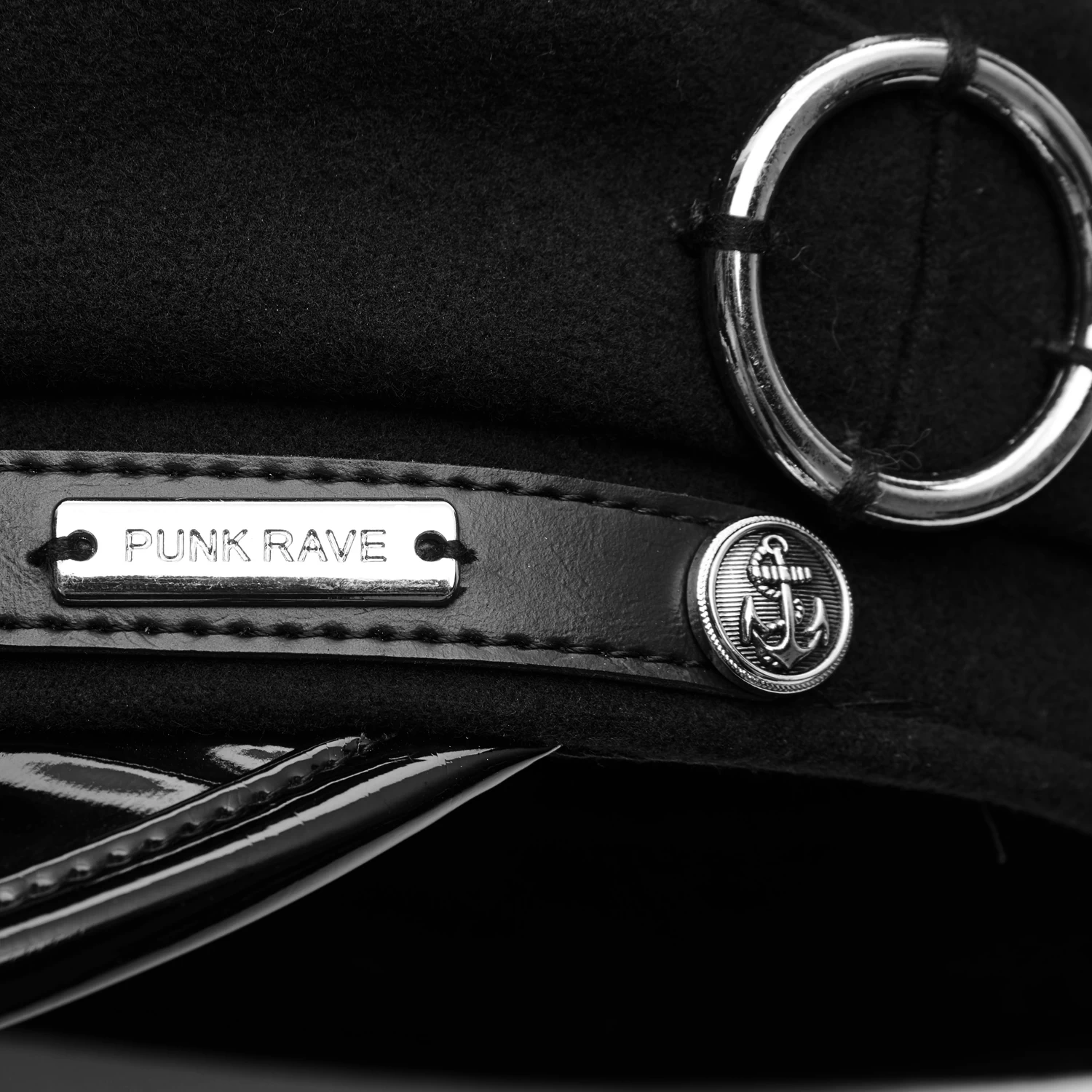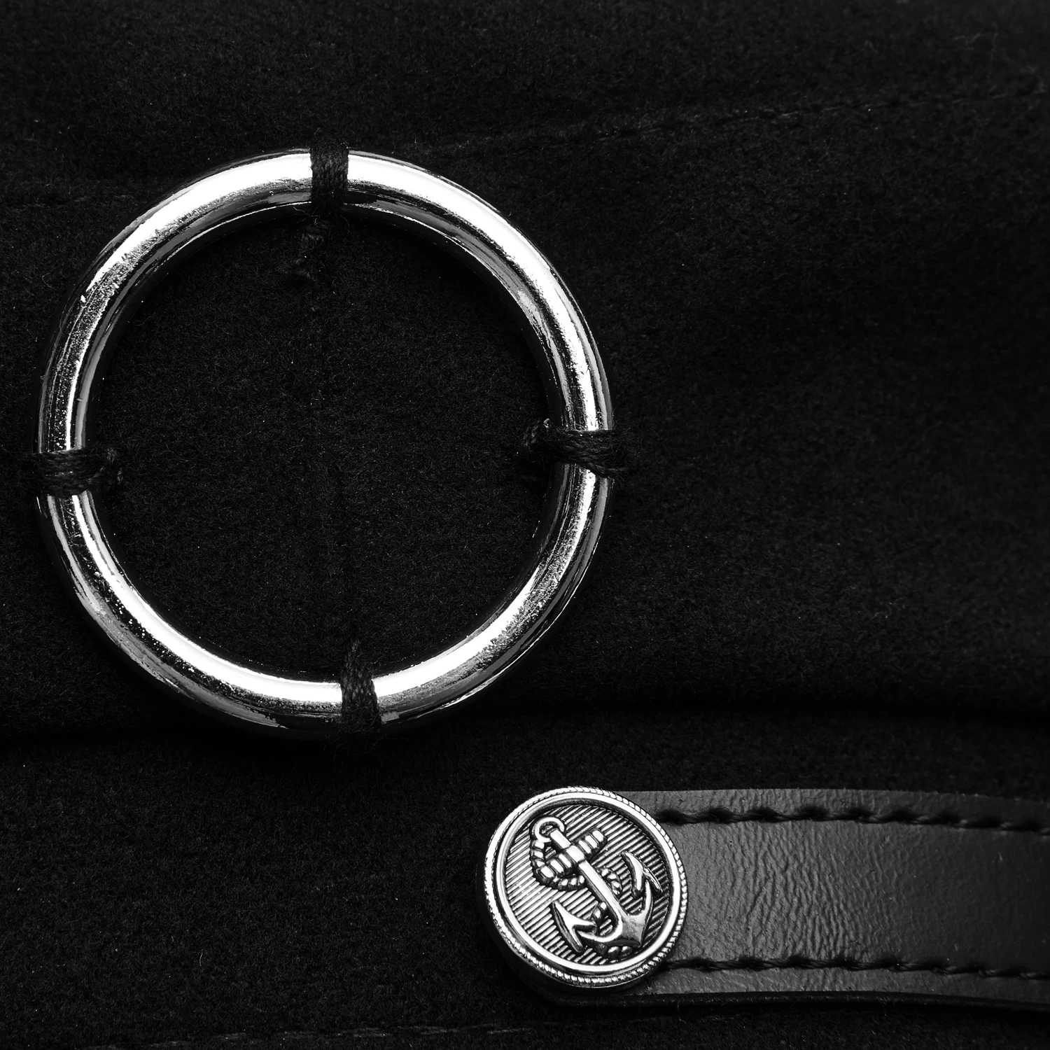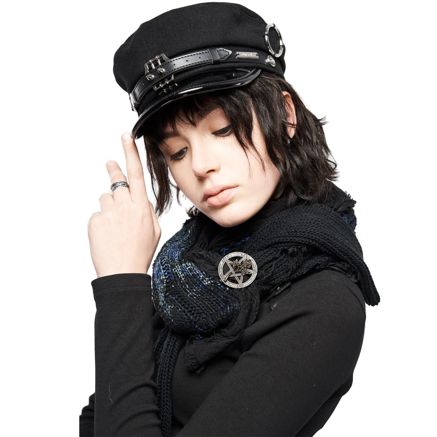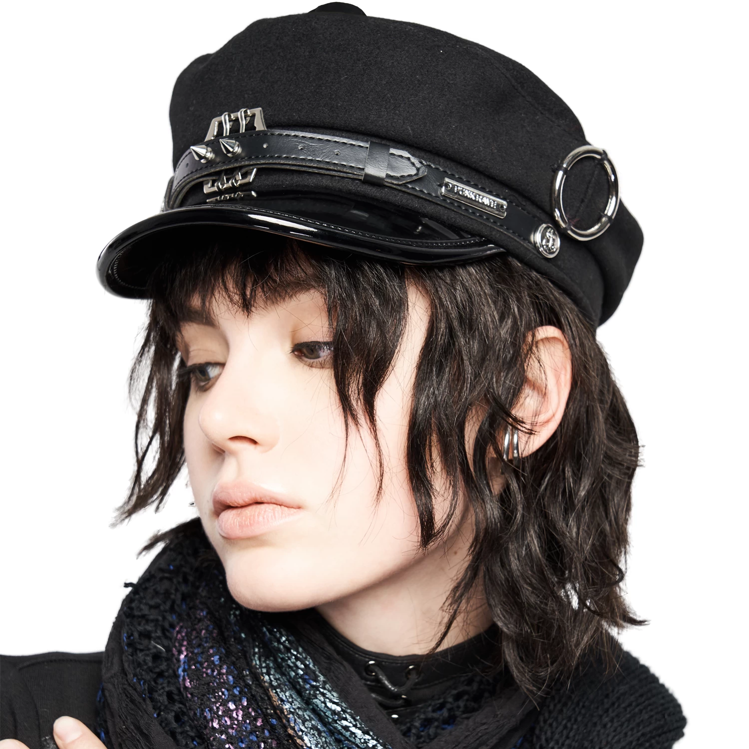 Casquette noire pour femme de style gothique et militaire avec deux spikes sur le devant, une boucle sur le cÎté gauche et un anneau sur le cÎté droit.