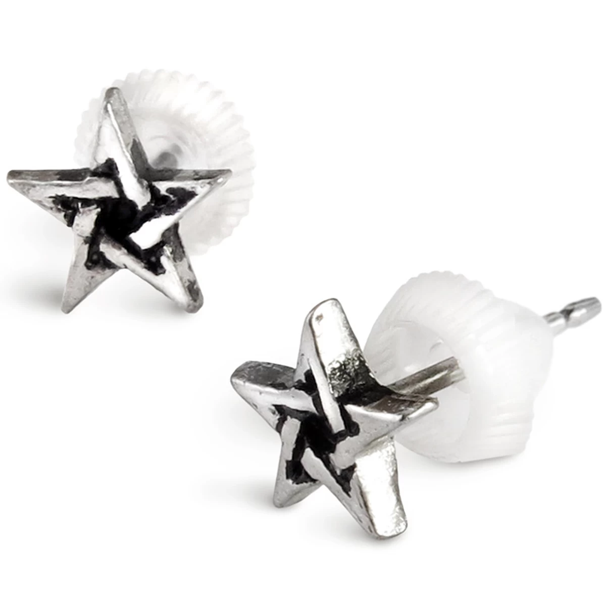 • Une paire de minuscules clous pentagramme découpés en étain, sur des tiges d’oreille en acier chirurgical.