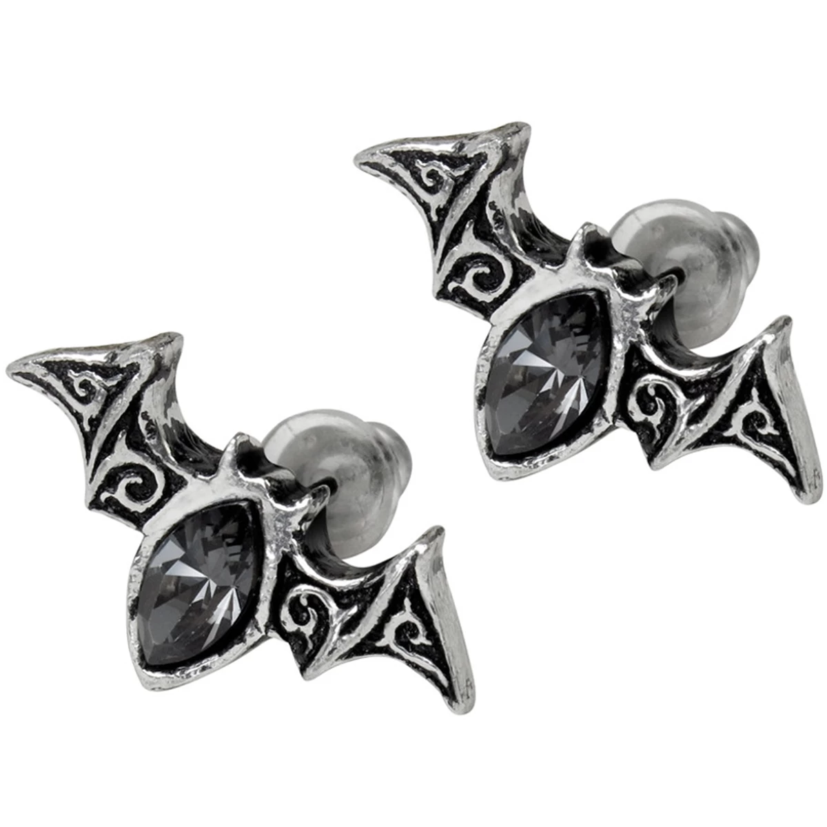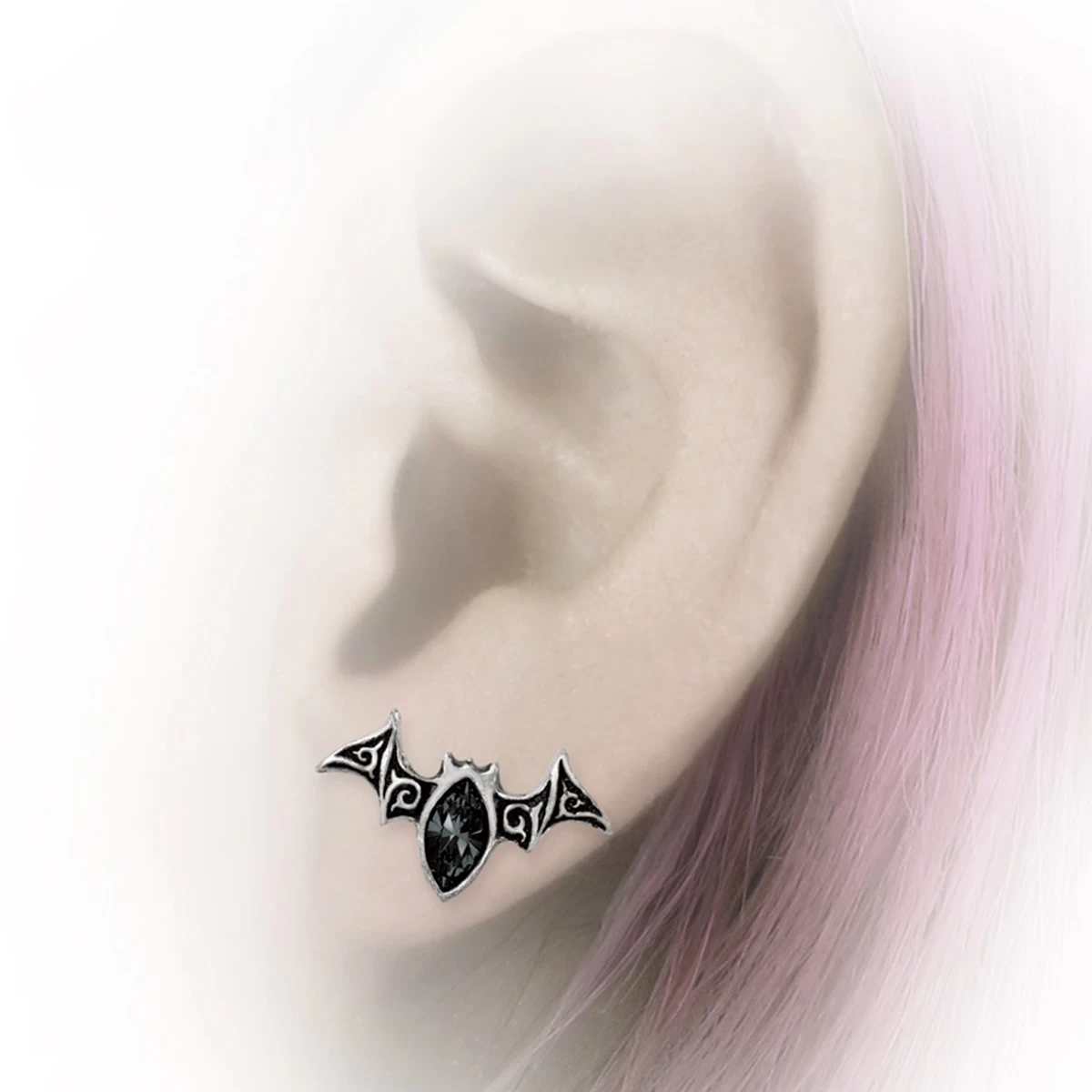 • Une paire de clous d’oreilles en étain en forme de petites chauves-souris stylisées avec des cristaux de diamant noir en forme de vésicule ; avec tiges d’oreille en acier chirurgical.