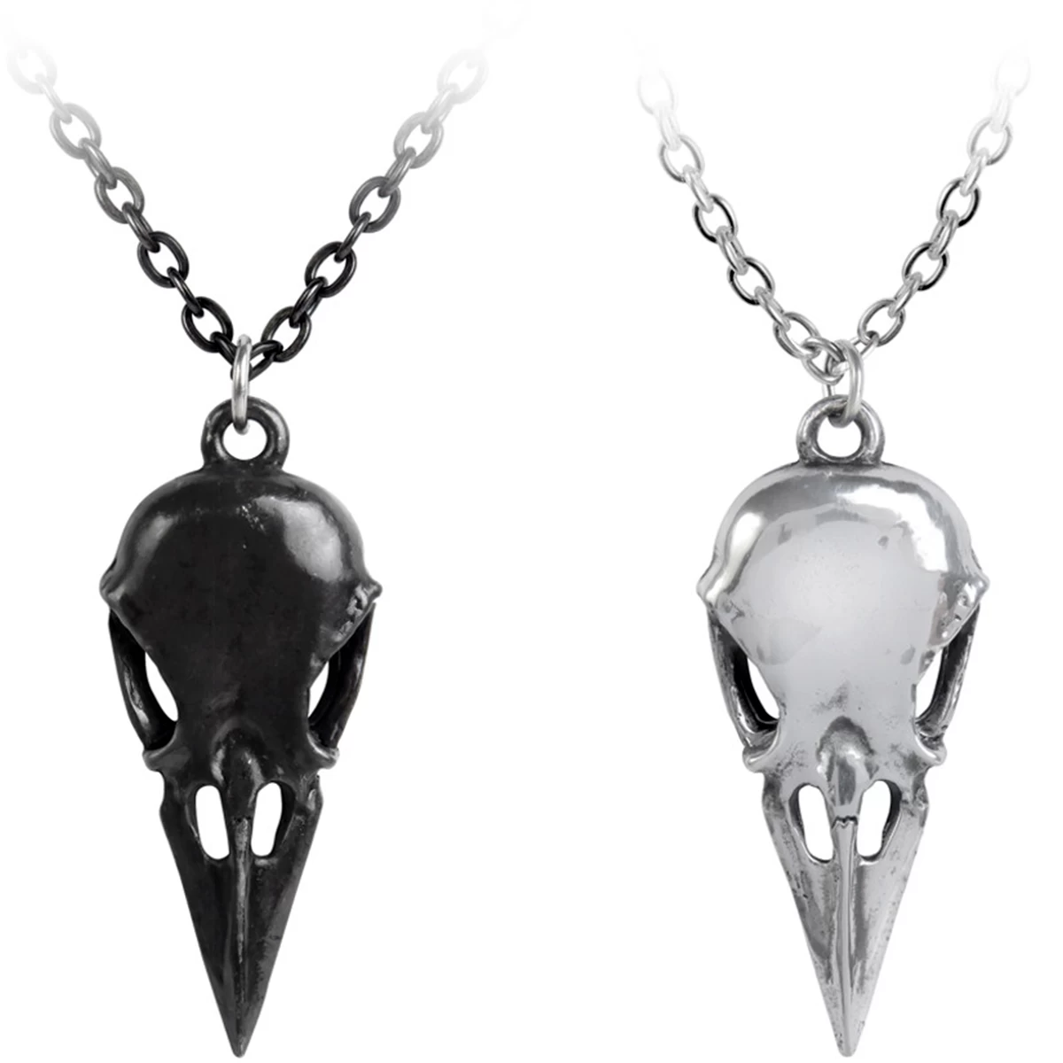 • Un collier pendentif double ; une paire de pendentifs complémentaires en forme de crâne de corbeau en étain formant un cœur lorsqu’ils sont maintenus ensemble, à porter comme un seul avec une double chaîne, ou séparés en deux pendentifs.