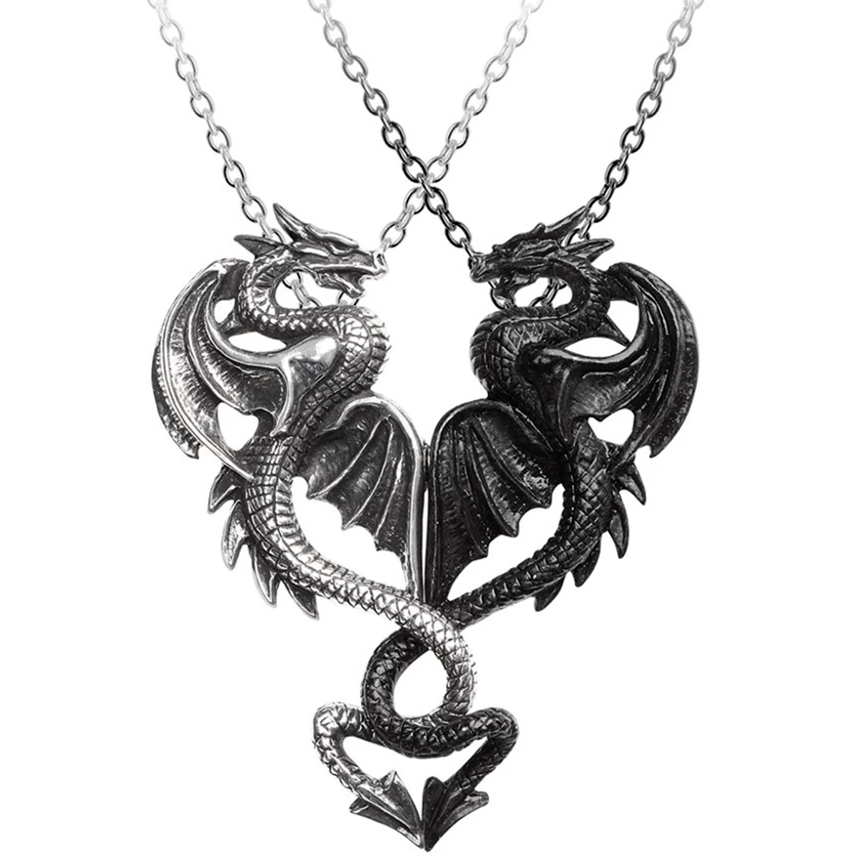 • Deux pendentifs en un ; des dragons en étain symétriques, l’un noir et l’autre en étain vieilli argenté, s’enlacent et se font face pour former une grande forme de cœur.