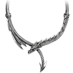• Un grand collier en étain massif, vieilli et poli, d’un dragon à épines s’enroulant autour du cou, sur une chaîne serpent continue avec sa tête recouvrant la queue et fermée par un fermoir magnétique sous sa tête.
