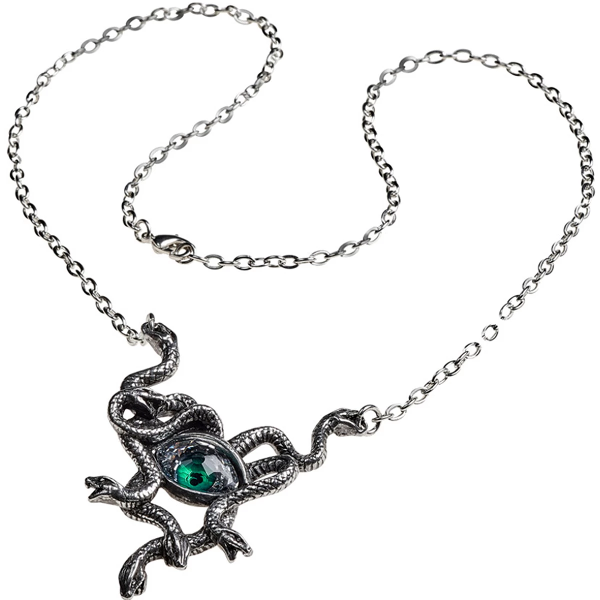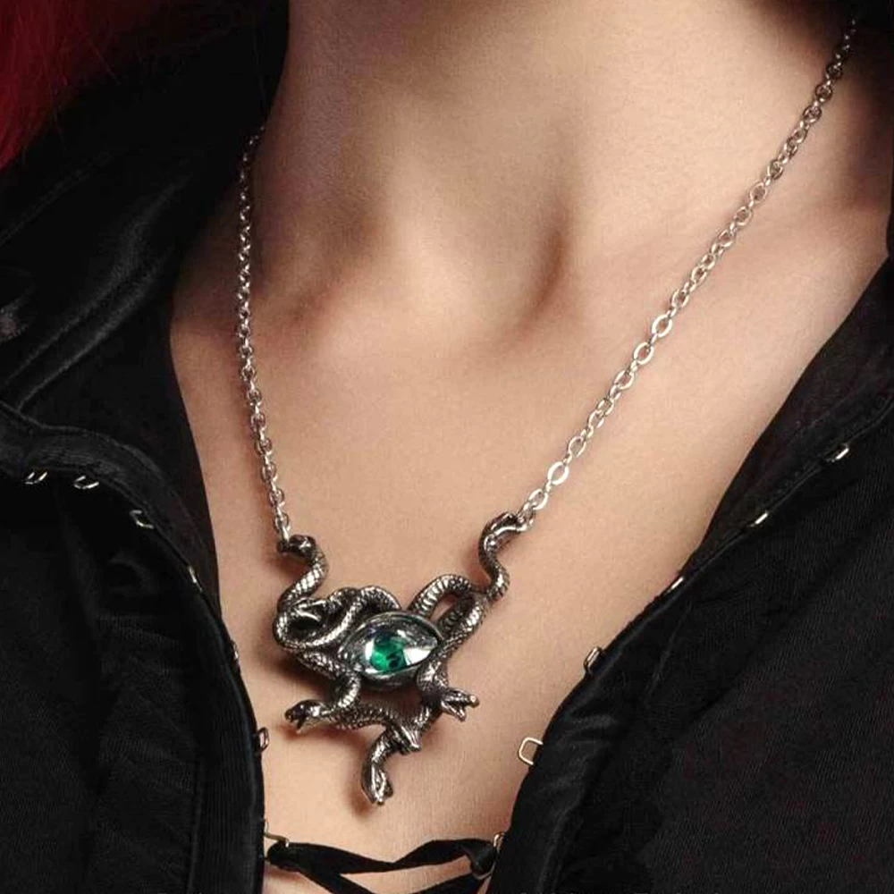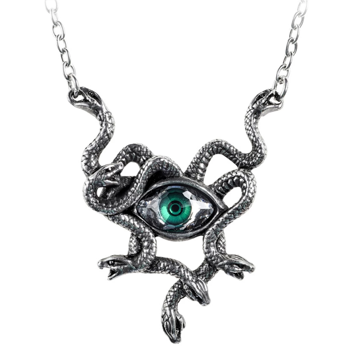 âą Le collier en Ă©tain d’un enchevĂȘtrement de serpents se tordant autour d’un Ćil en cristal autrichien facettĂ© avec iris vert Ă©meraude.