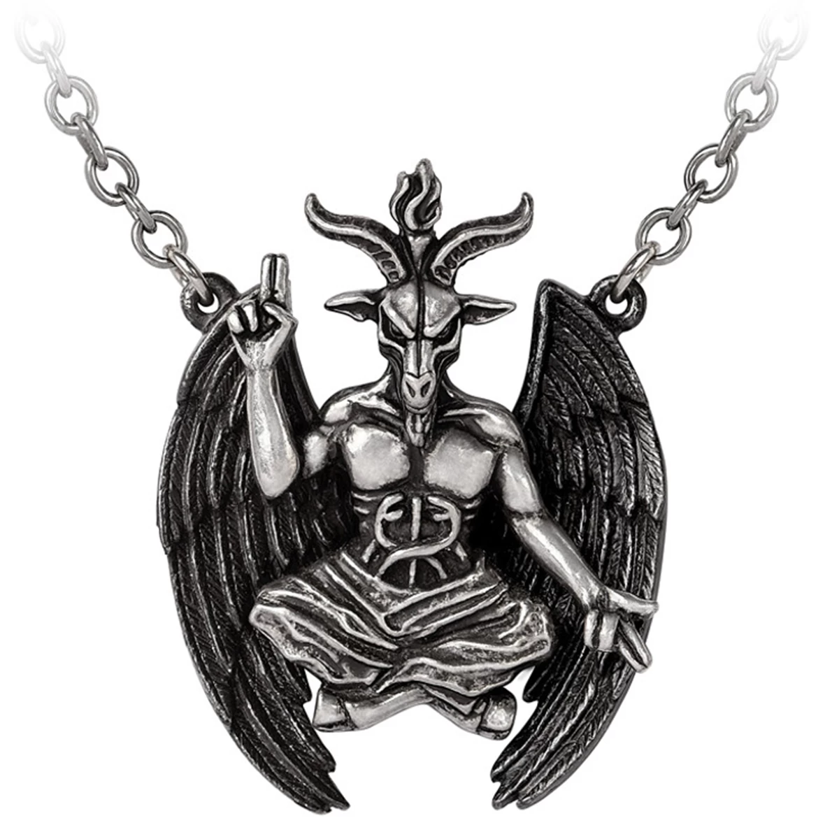 • Ce Baphomet est une pièce de déclaration faite à la main ! Avec des ailes en étain noirci et un corps en étain poli.