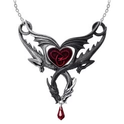 • Un collier en étain de 93 mm de largeur sur 7 mm de profondeur composé de deux dragons entrelacés en miroir, l’un noir, l’autre argenté, avec un cœur émaillé trans-rouge en son centre et suspendu à un cristal autrichien en forme de larme rouge.