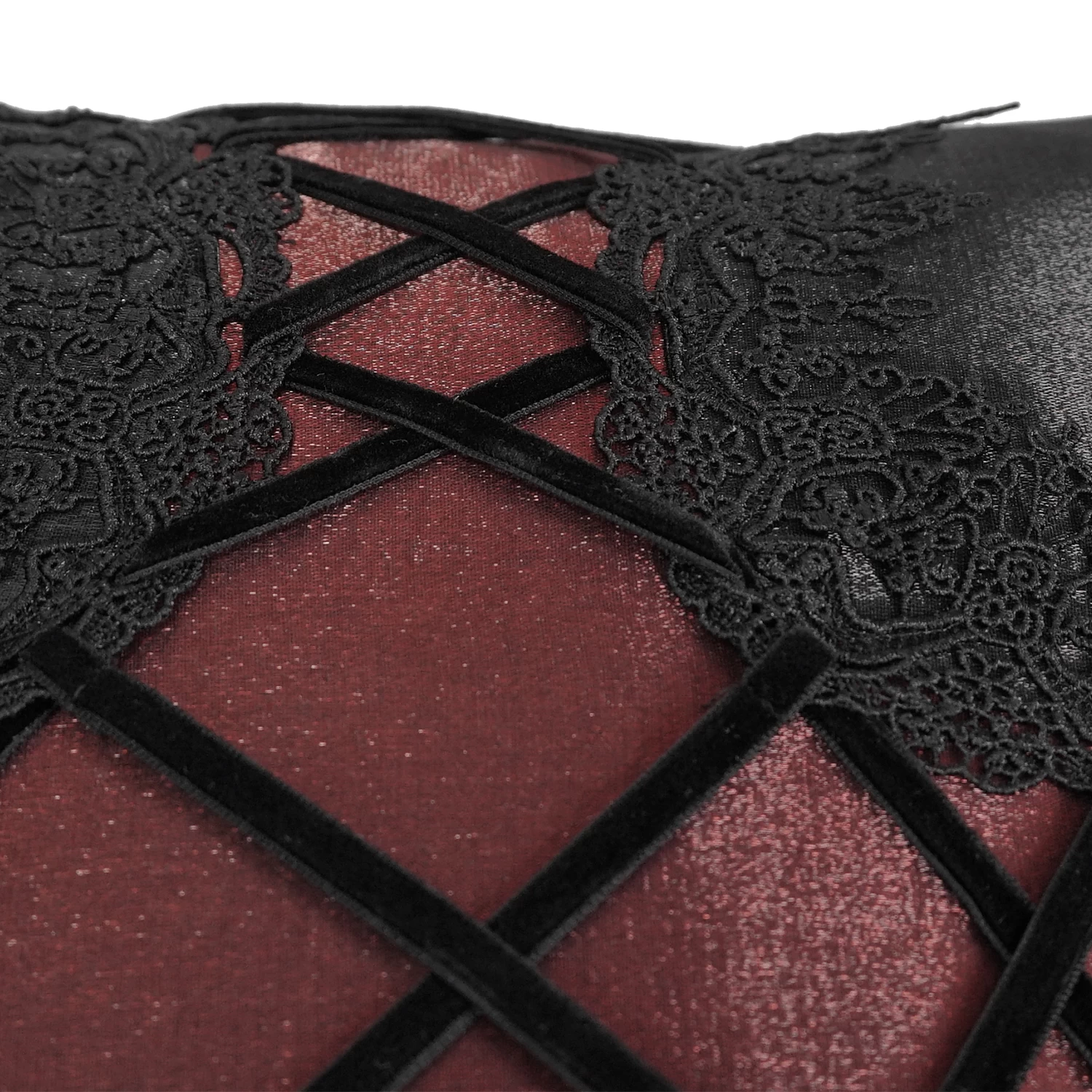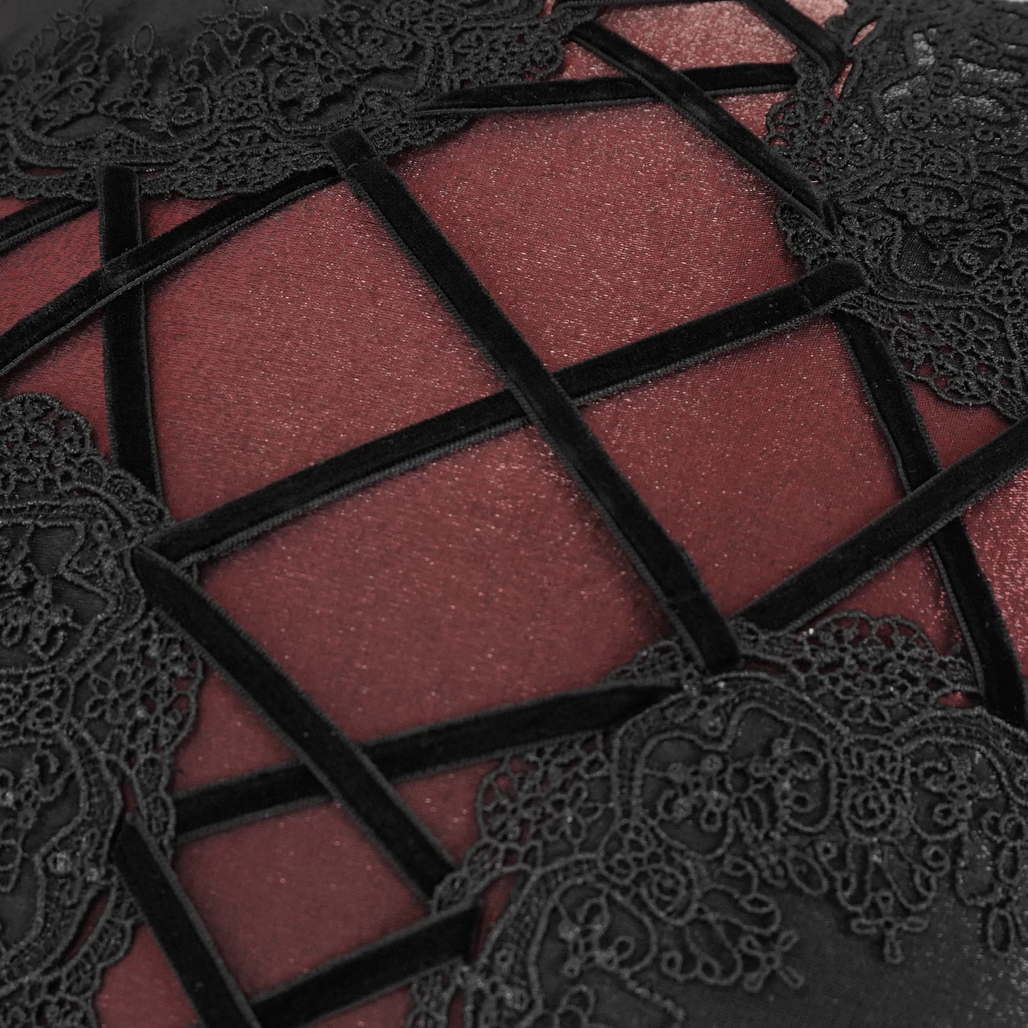 En tissu noir brillant, avec un tissu bordeaux en forme de croix brillante au milieu