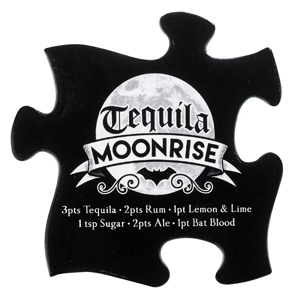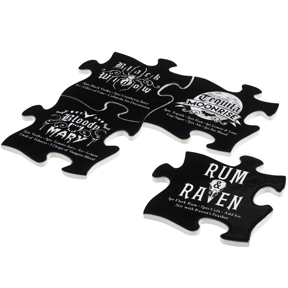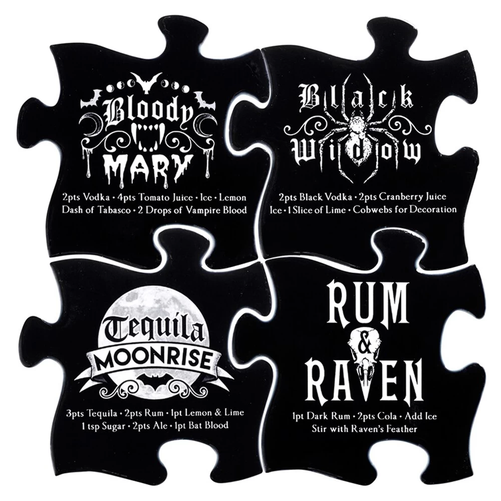 Ensemble de 4 sous-verres en forme de puzzle, avec une recette de cocktail différente pour chaque sous-verre.