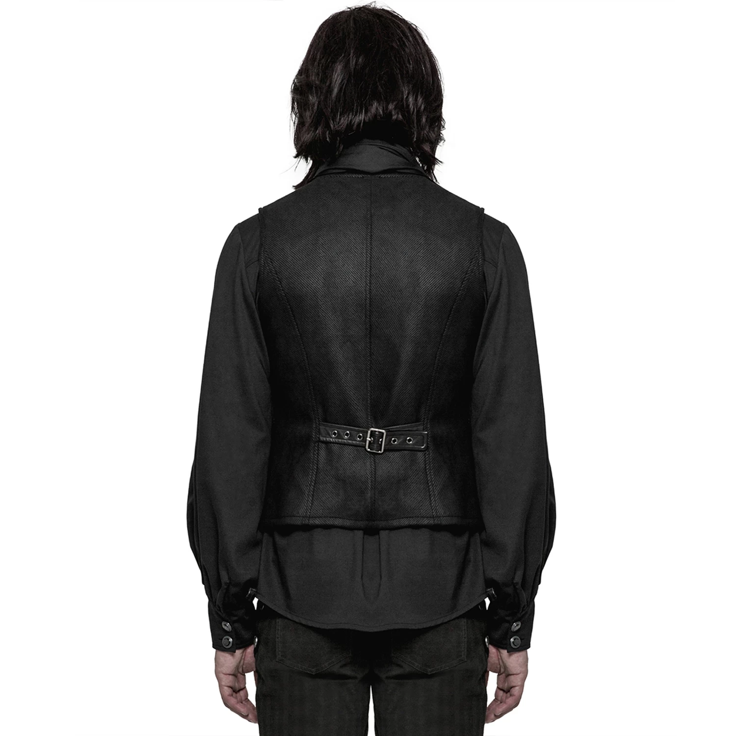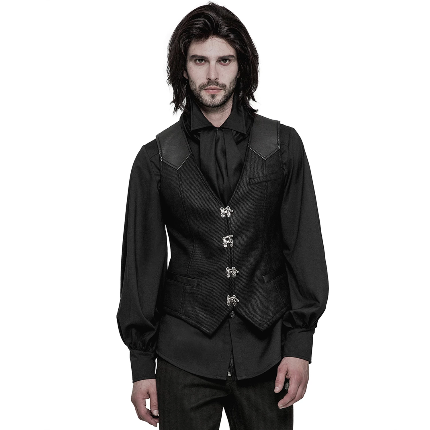 Gilet pour homme gothique noir avec détails en cuir synthétique et fermeture à crochet à l’avant.