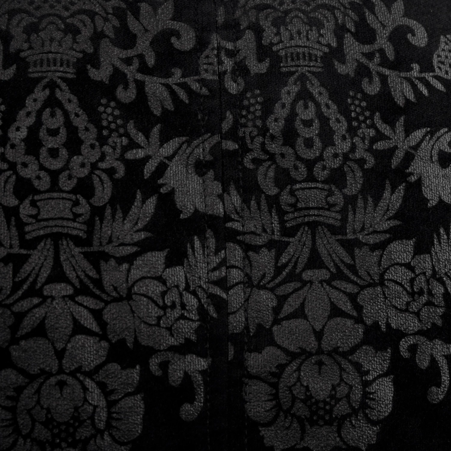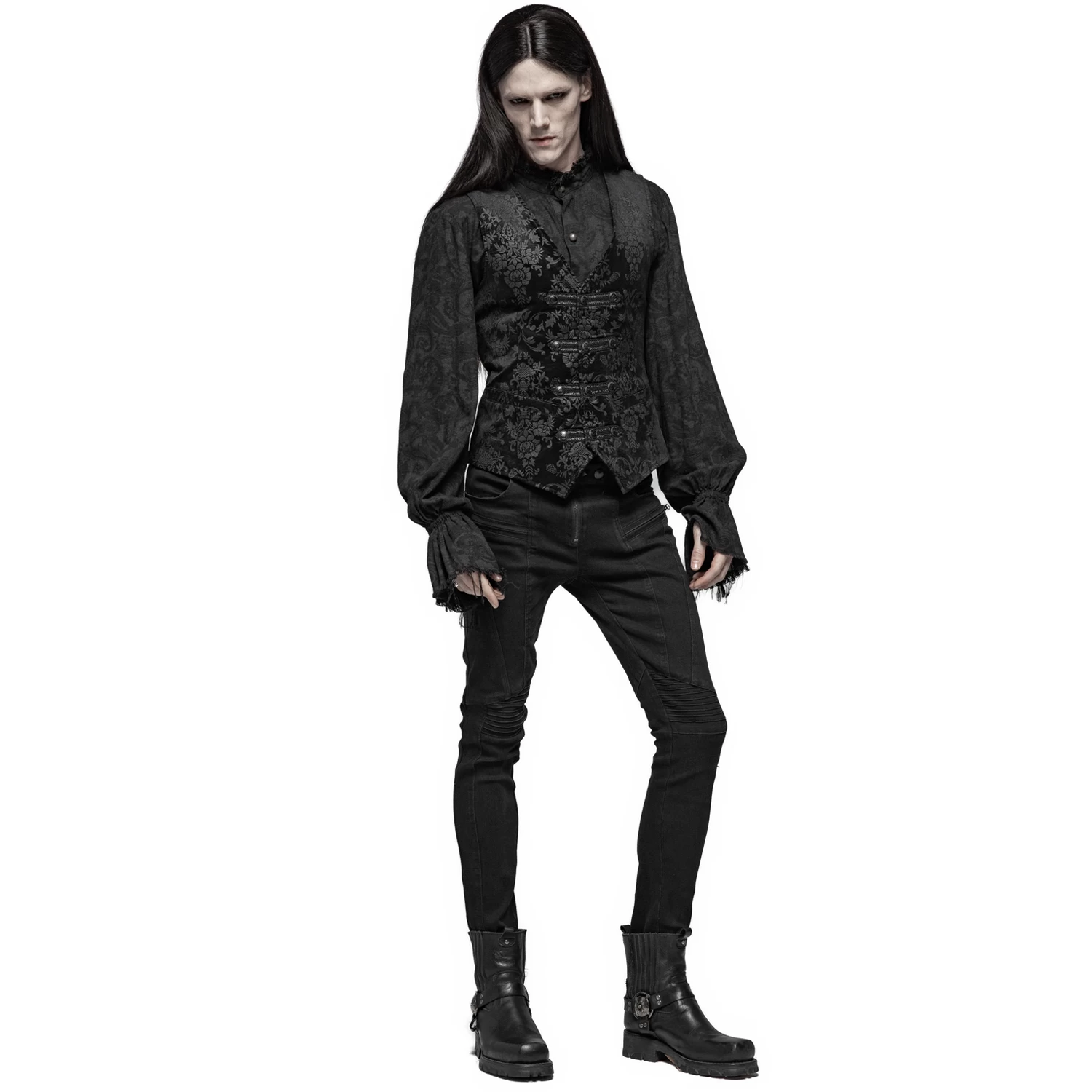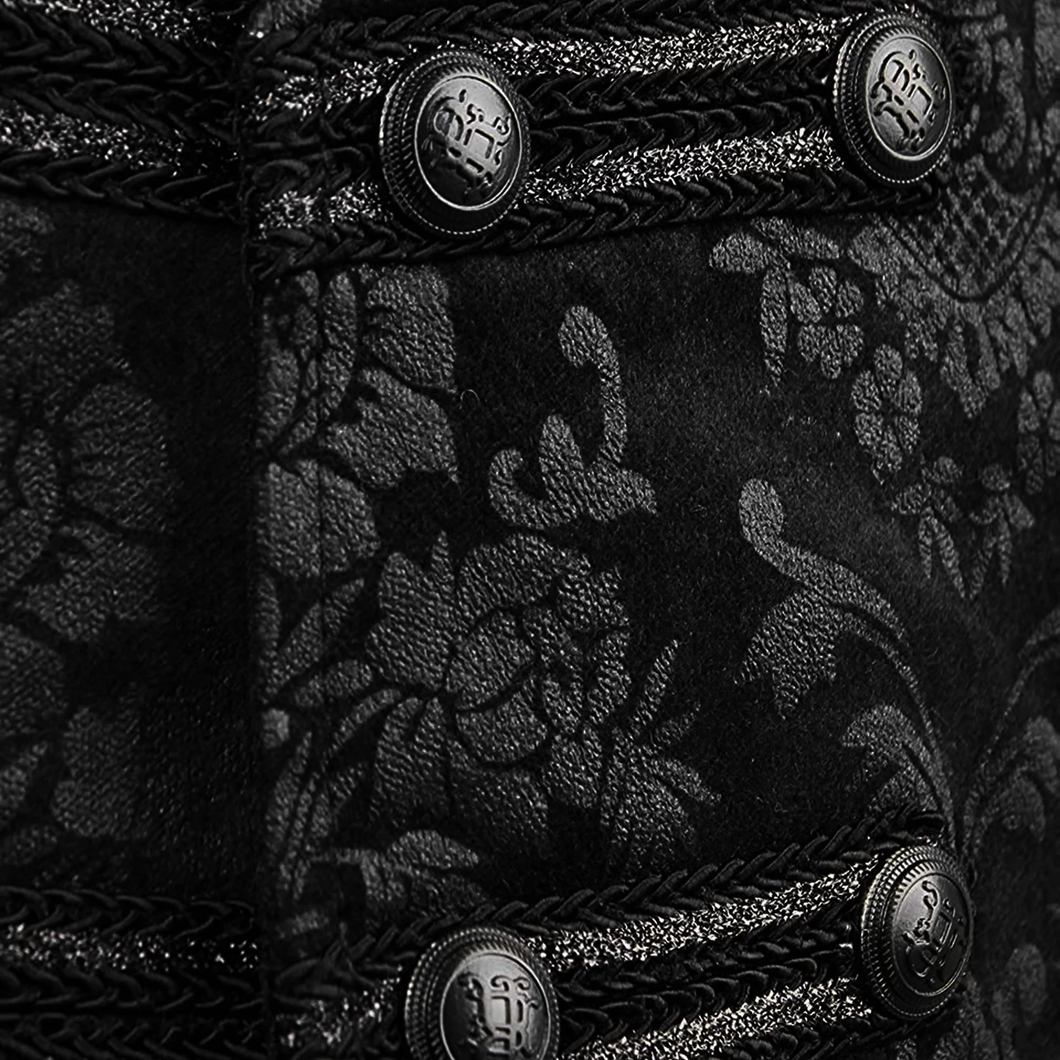 Gilet damassé noir-gris pour hommes de style gothique victorien, orné de sangles en ruban de satin sur la fermeture frontale et de boutons noirs estampés.