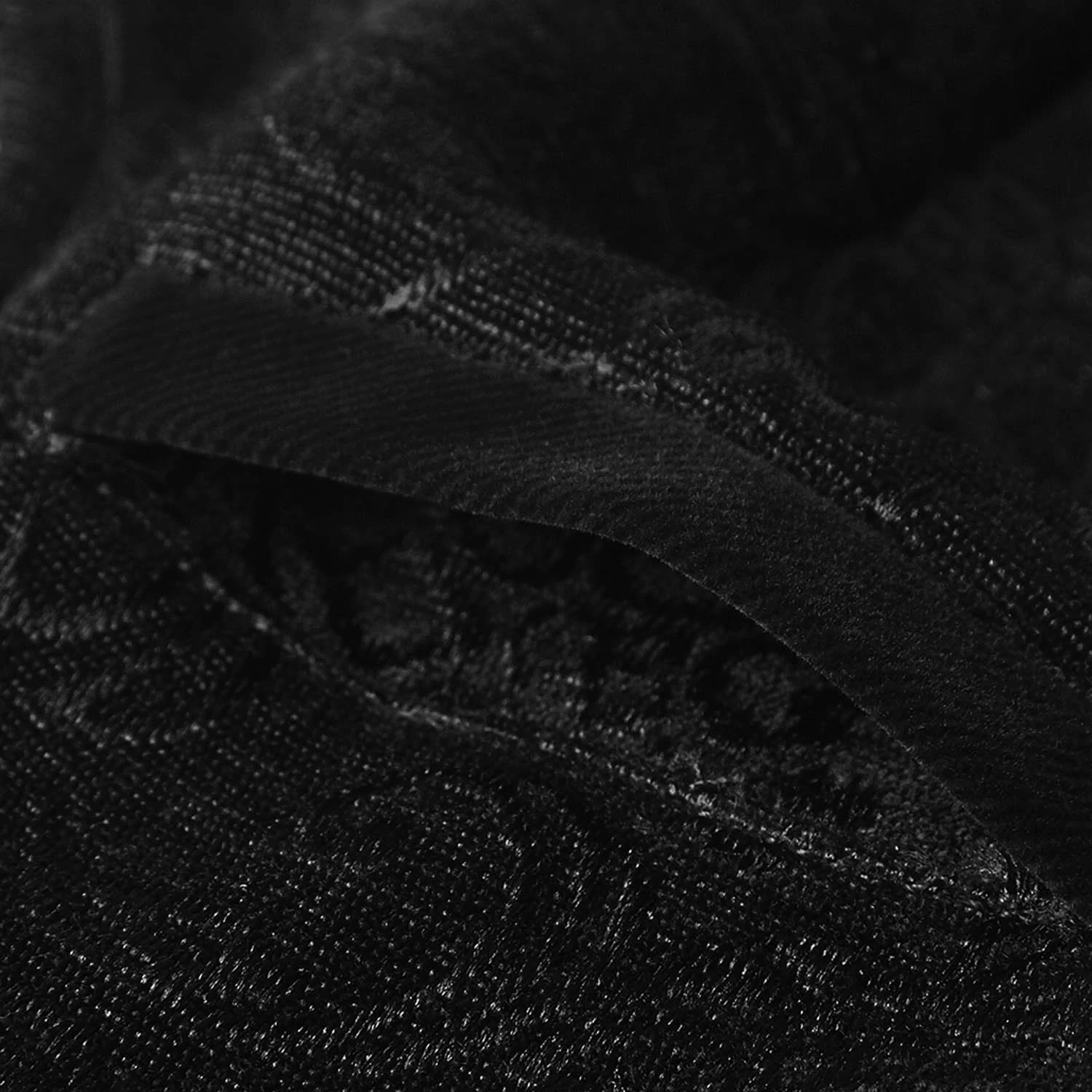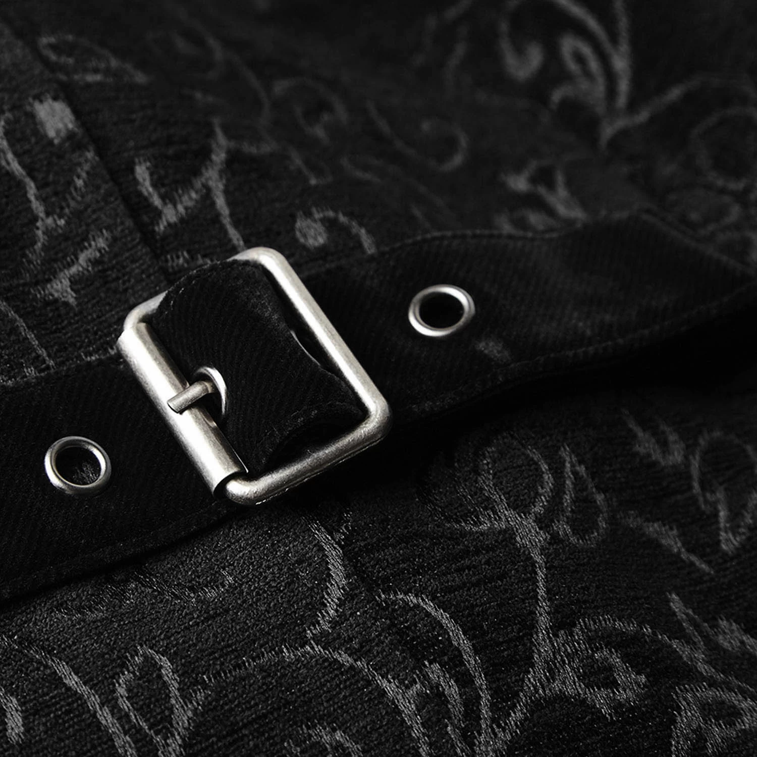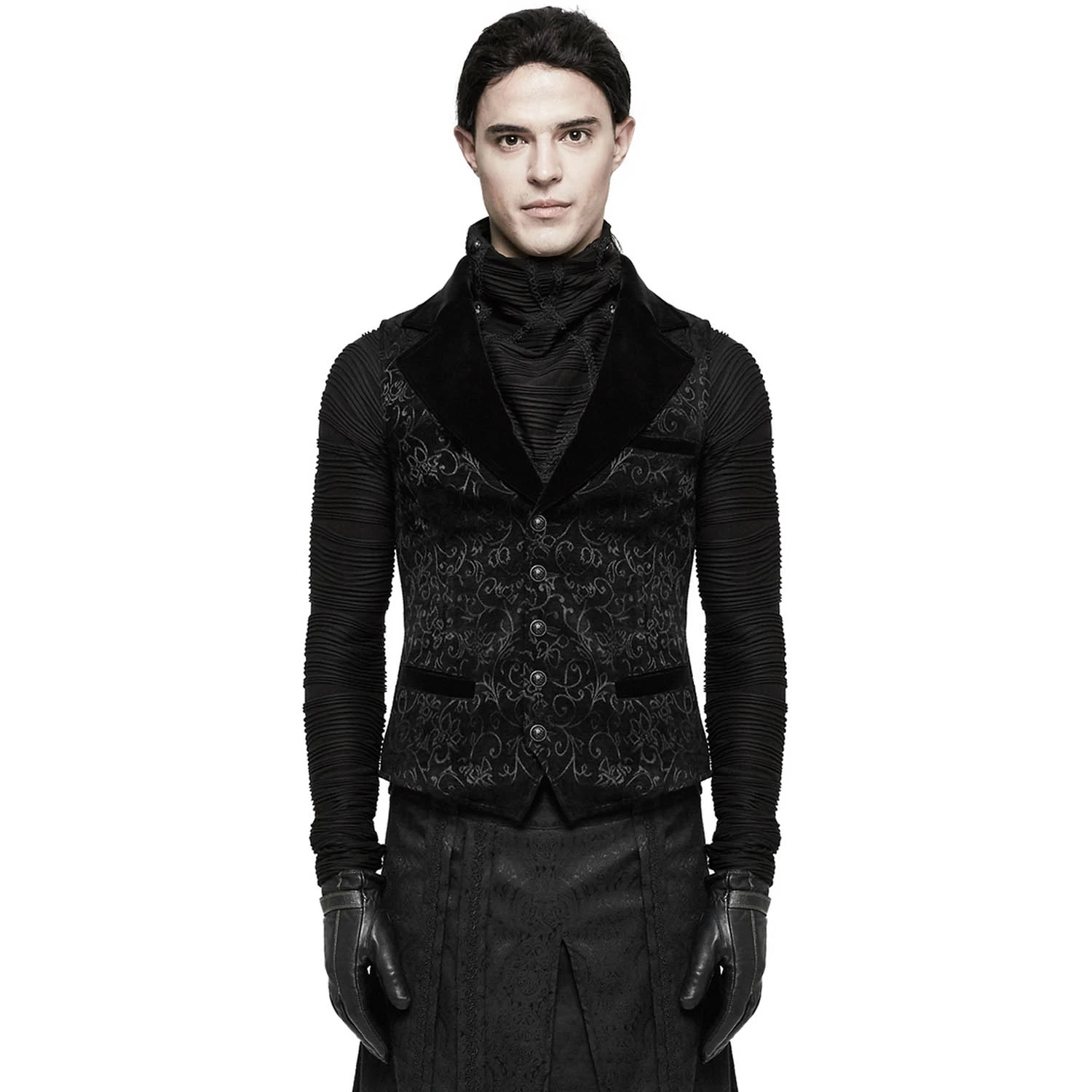 Gilet boutonné noir de style classique gothique victorien avec col en V, boutons noirs estampés et col en velours noir.