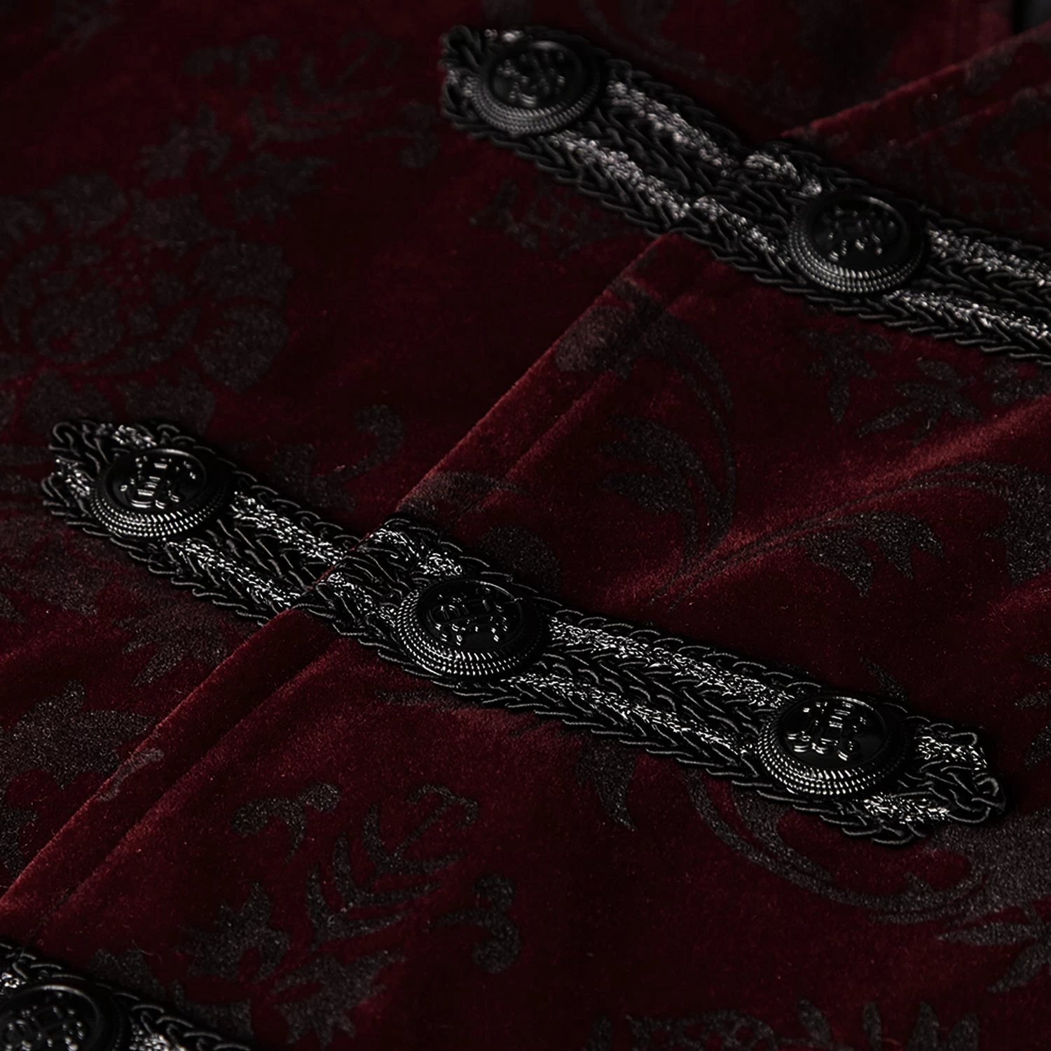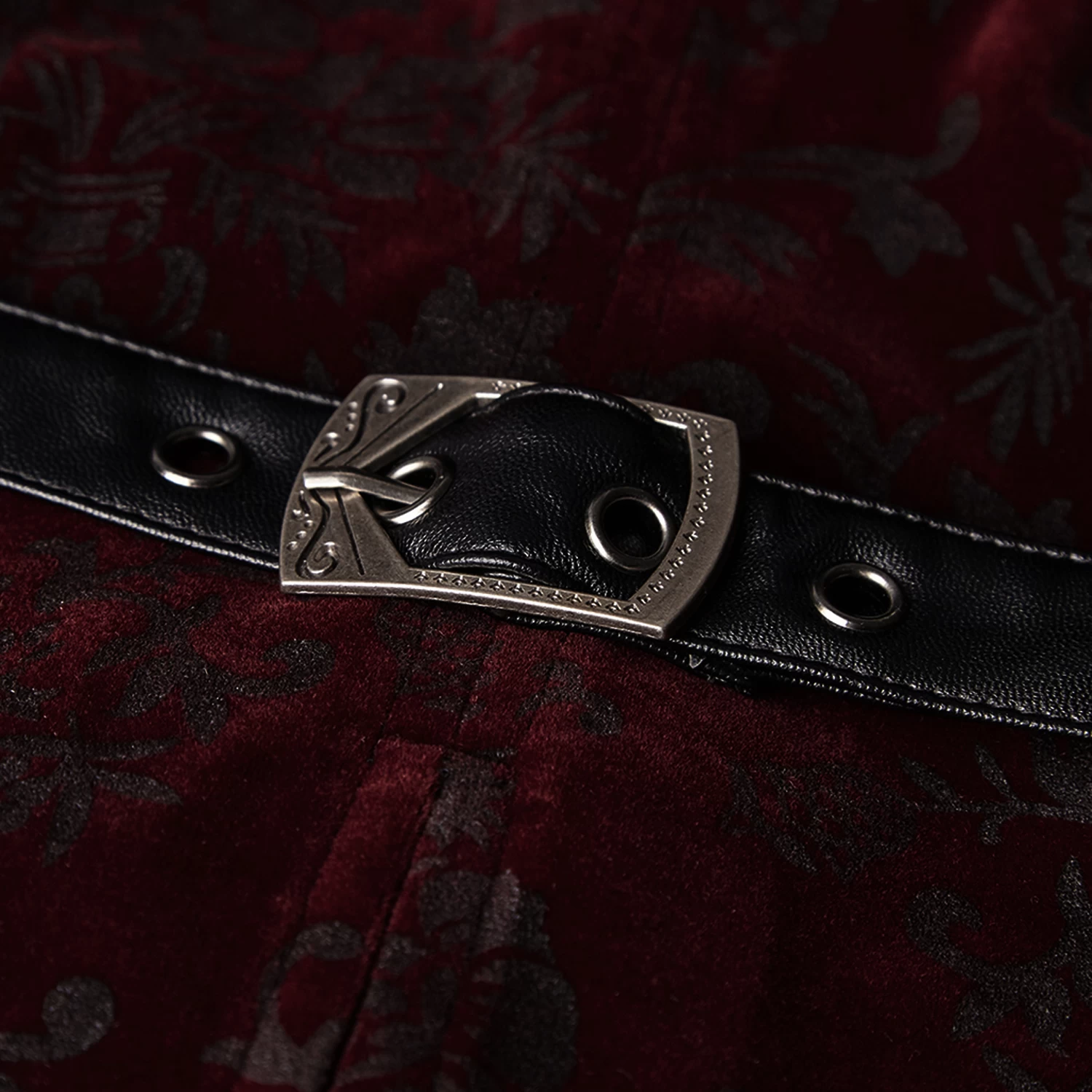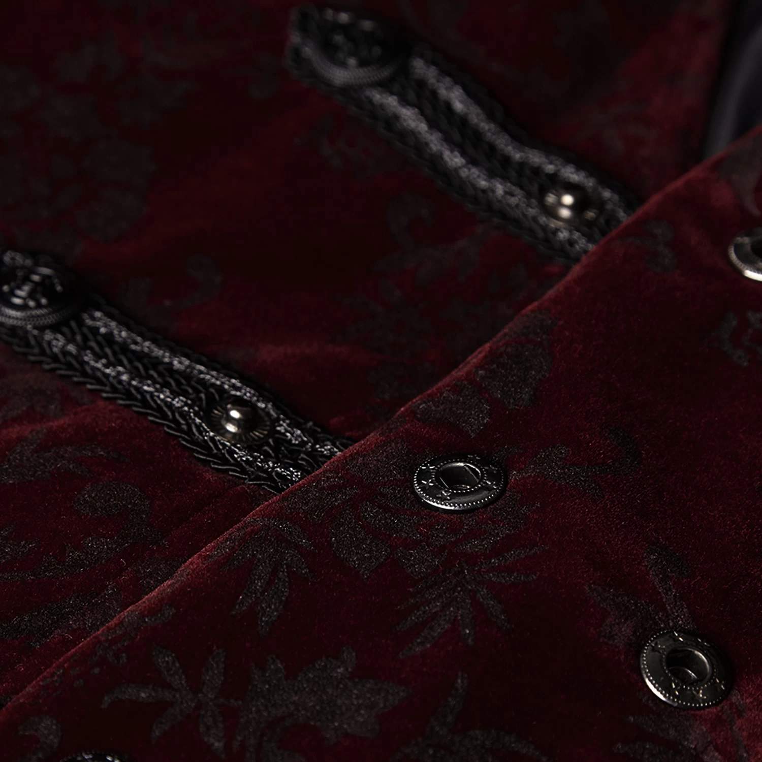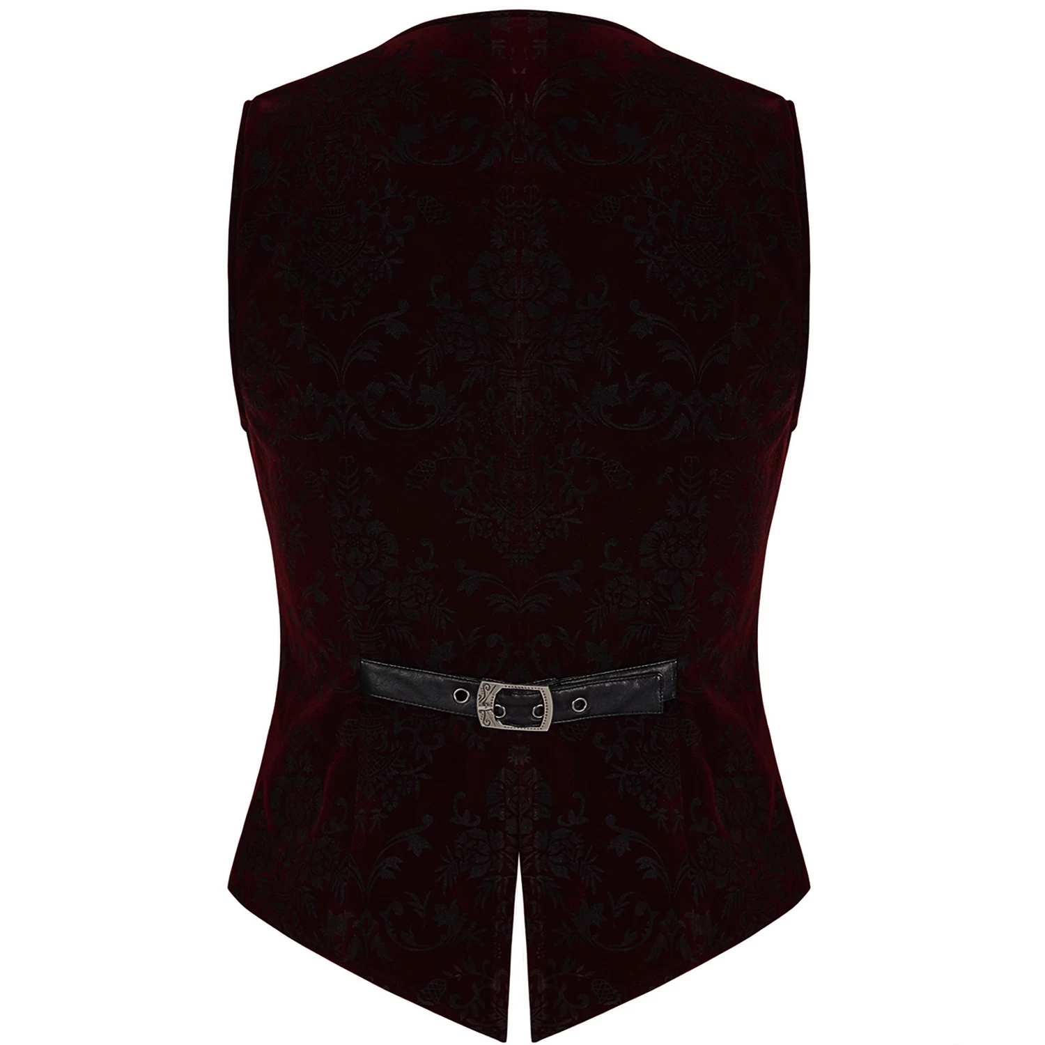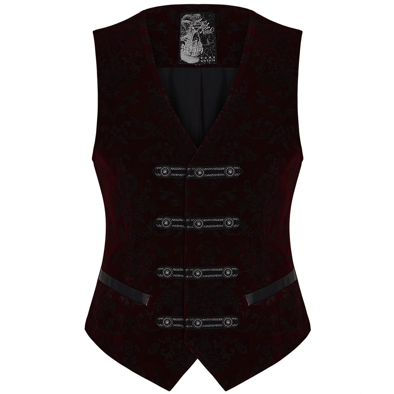 Gilet damassé bordeaux pour hommes de style gothique victorien, orné de sangles en ruban de satin sur la fermeture frontale et de boutons noirs éstampés.