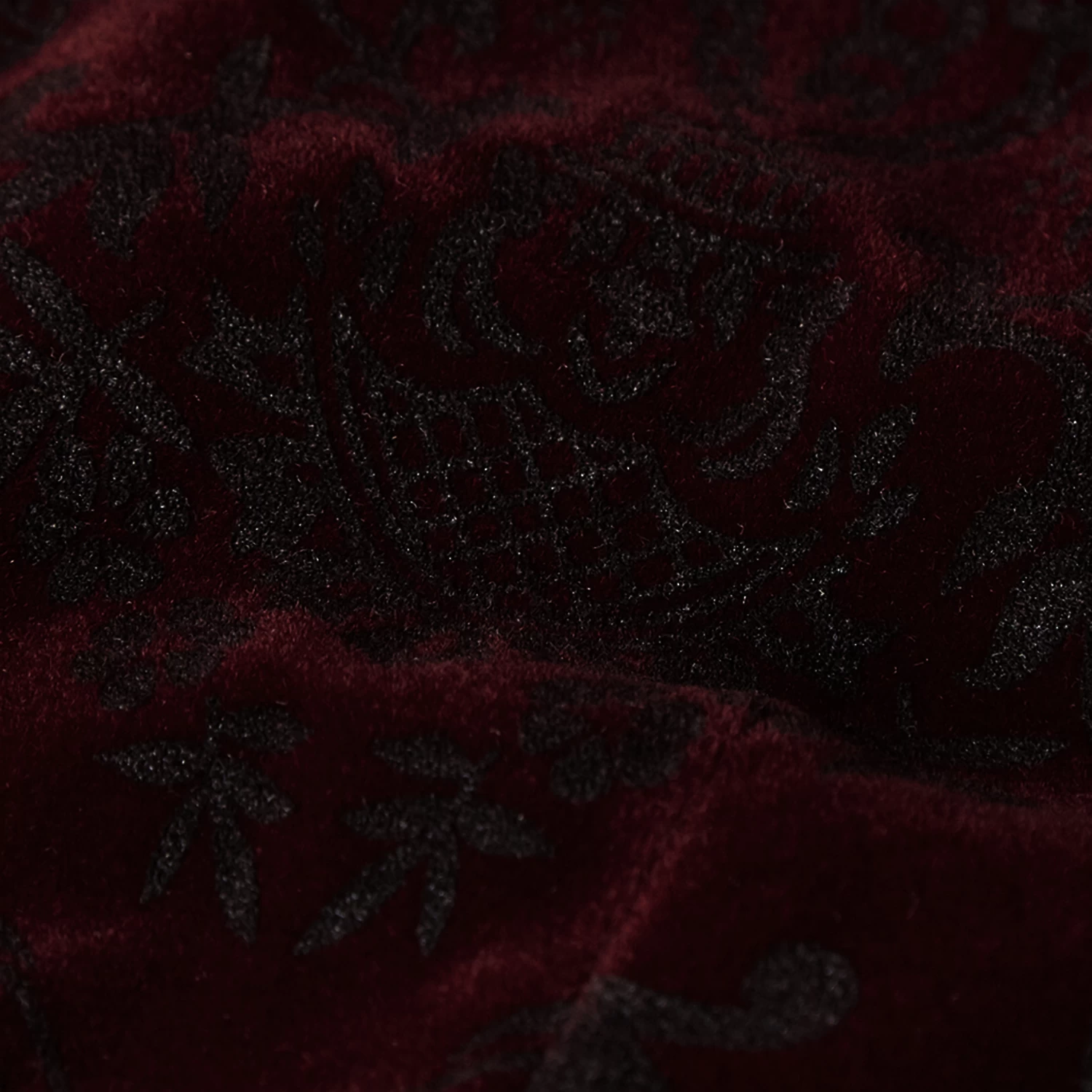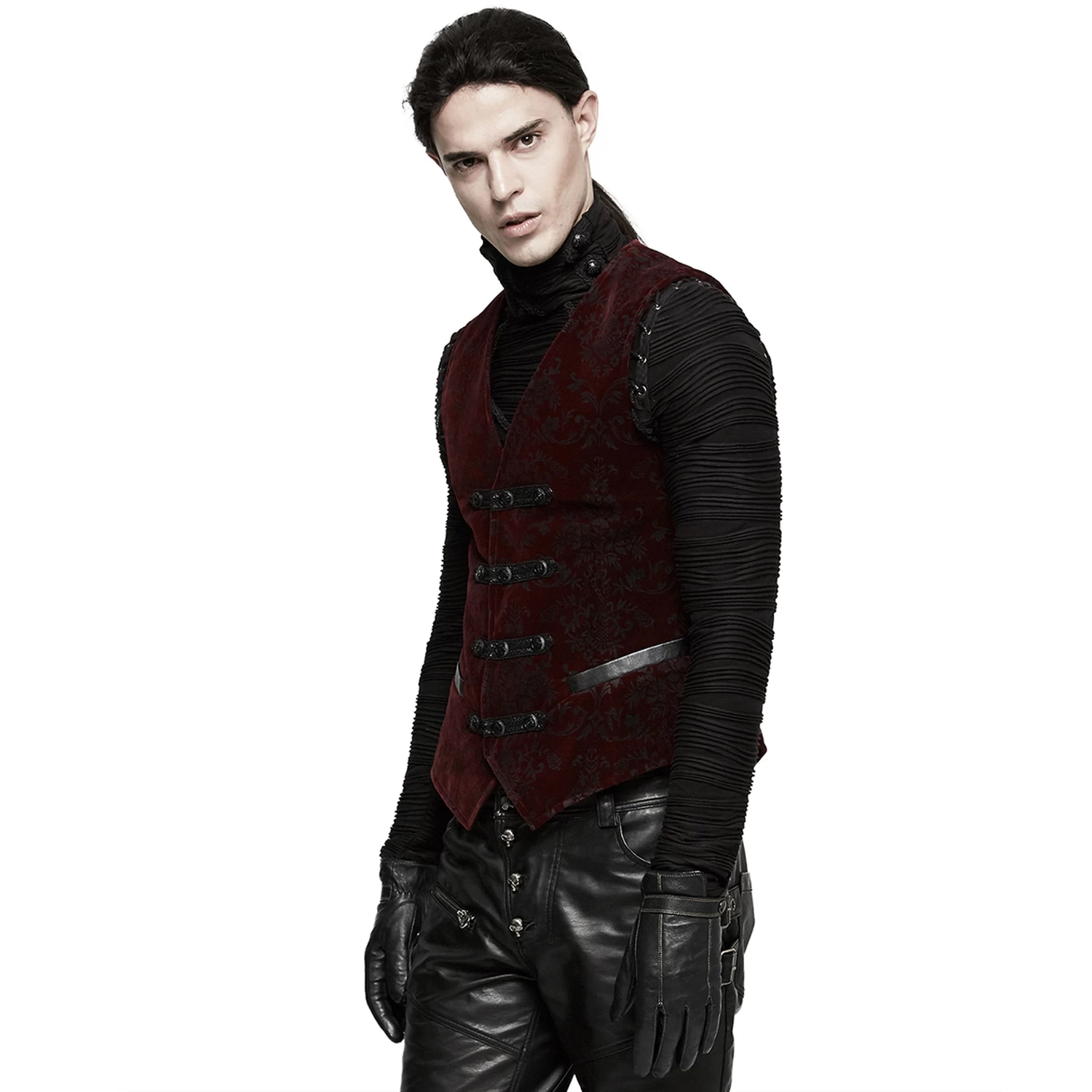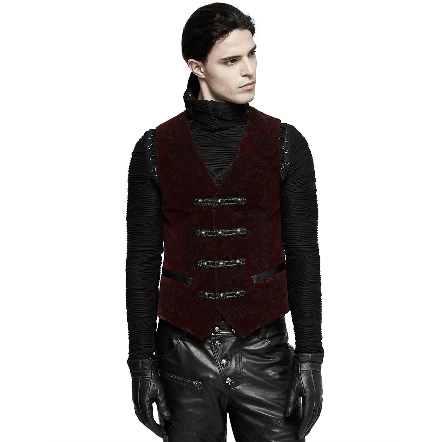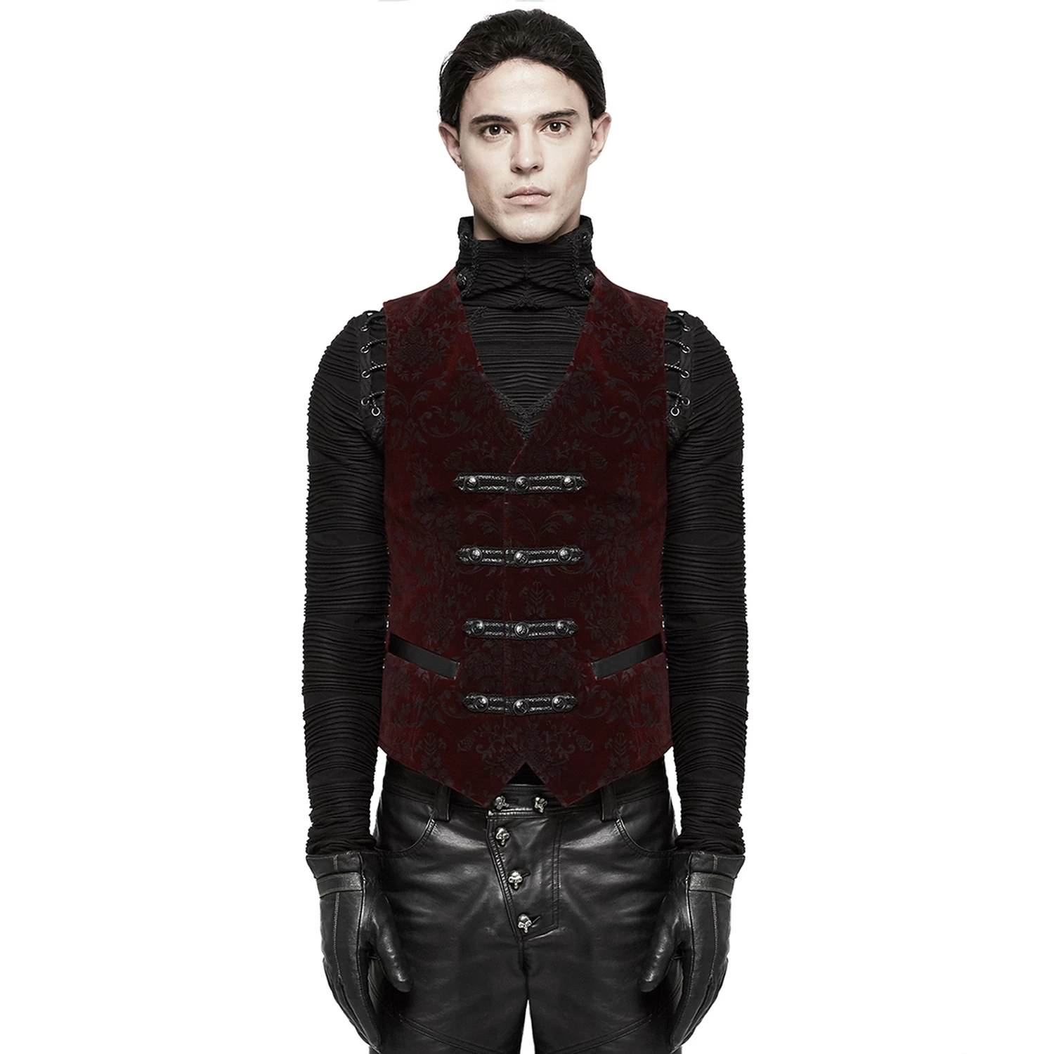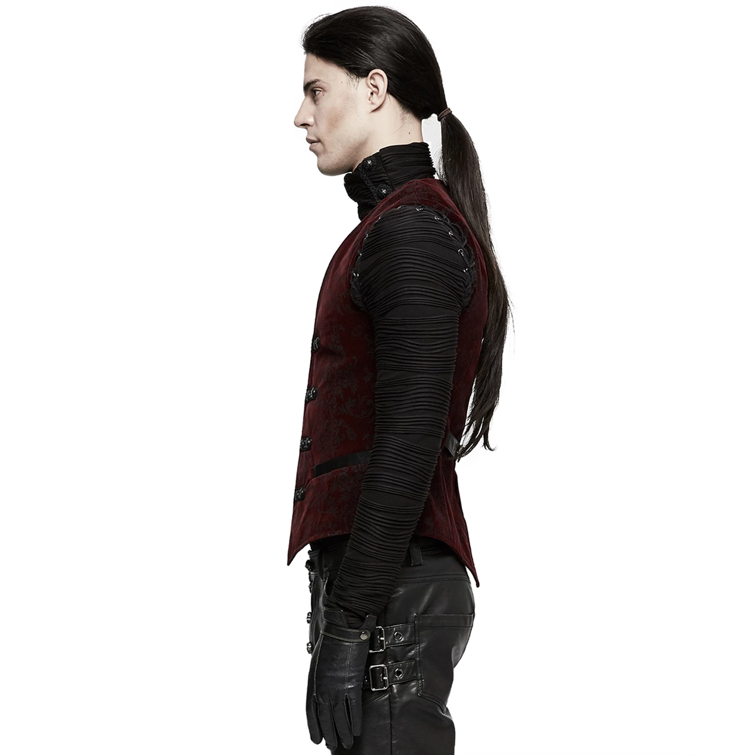 Gilet damassé bordeaux pour hommes de style gothique victorien, orné de sangles en ruban de satin sur la fermeture frontale et de boutons noirs éstampés.