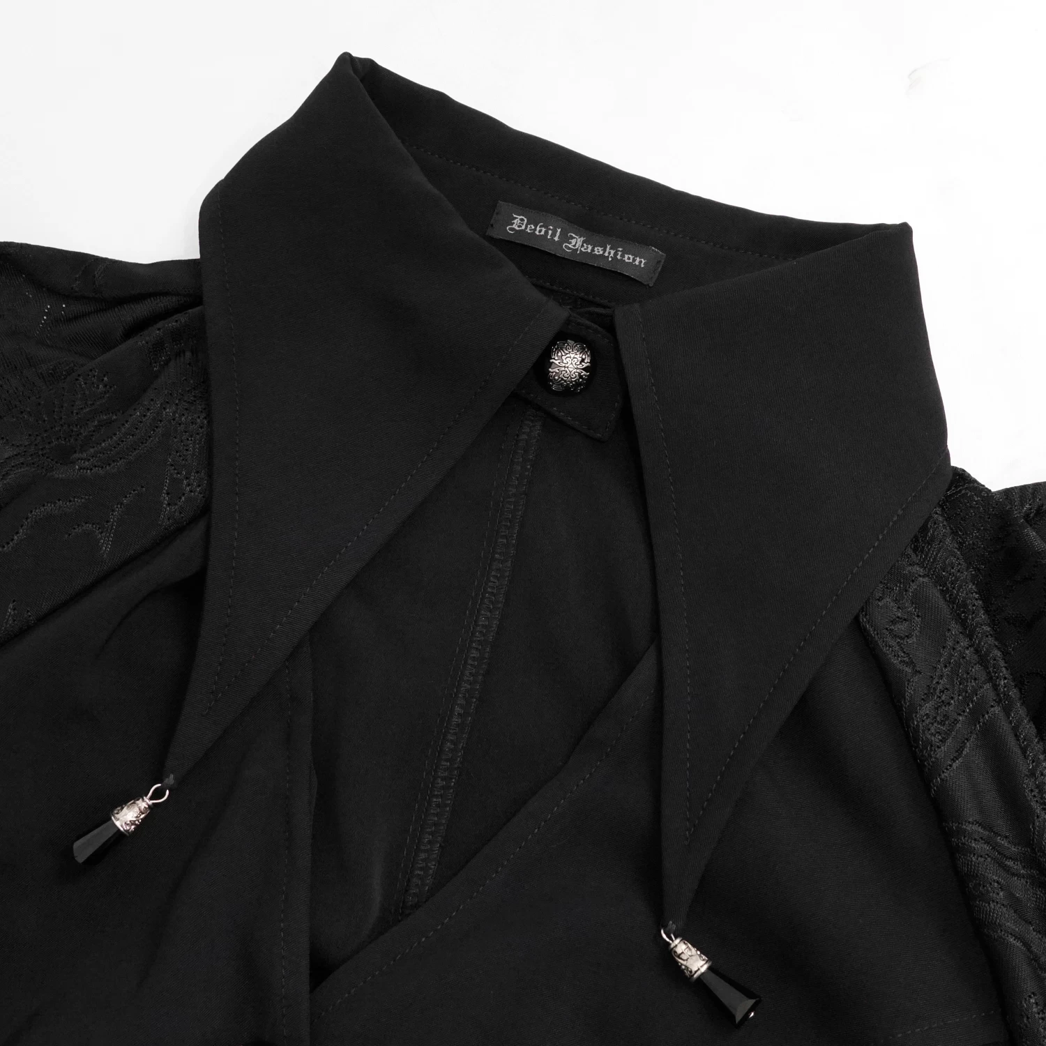 • Manches froncées aux coudes et évasées aux poignets avec un tissu à motif brocard et terminées par une délicate dentelle noire