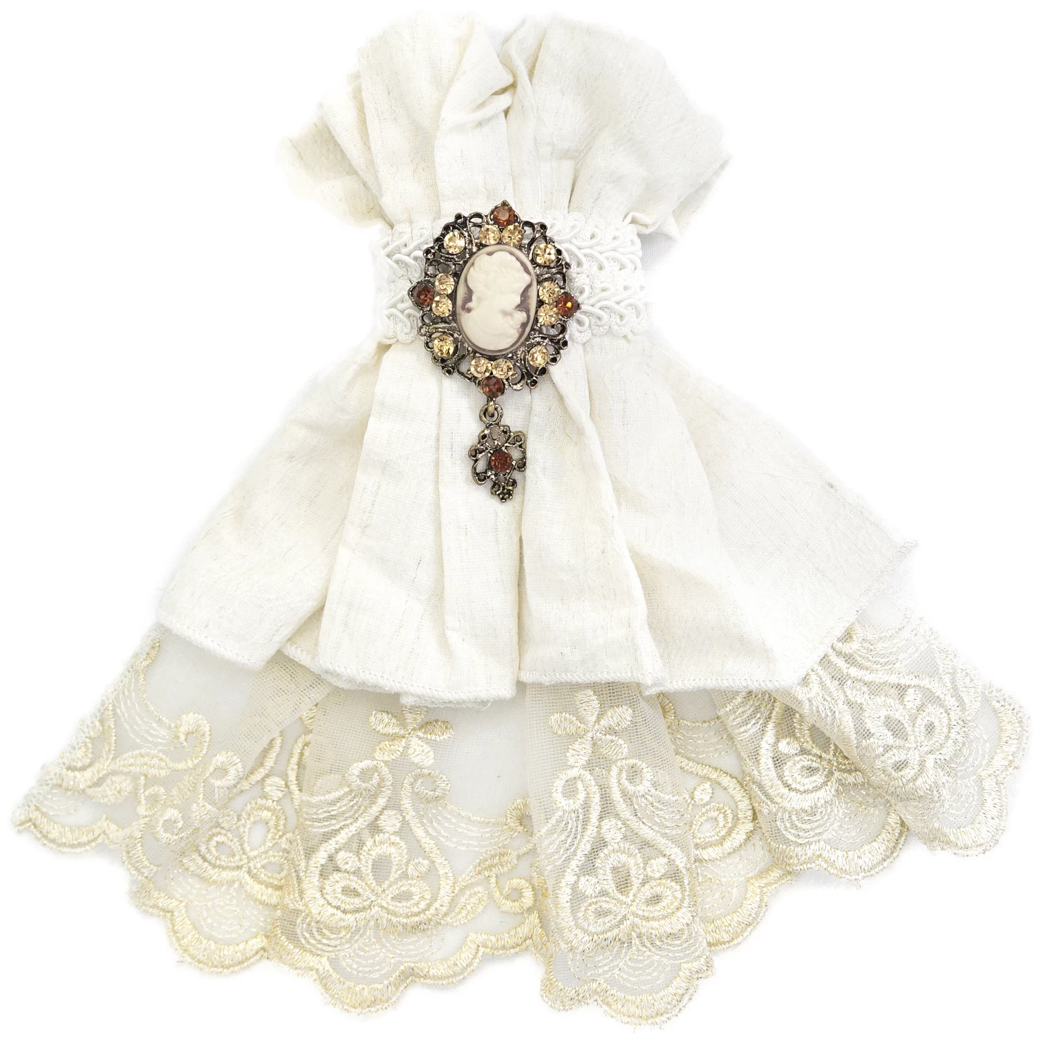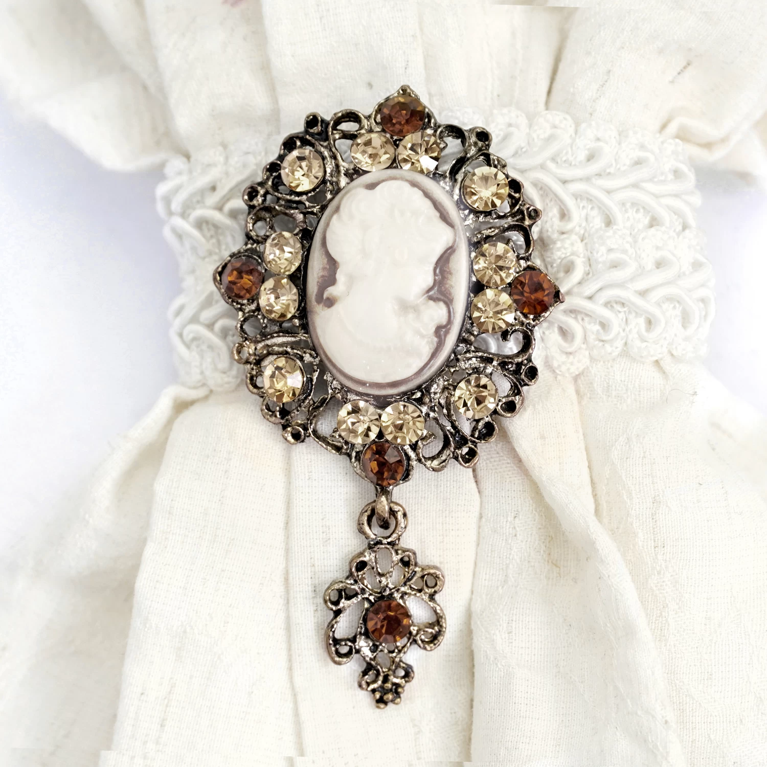 • Grande broche avec un camée de couleur ivoire placé dans un cadre en filigrane de vrilles de couleur vieil or