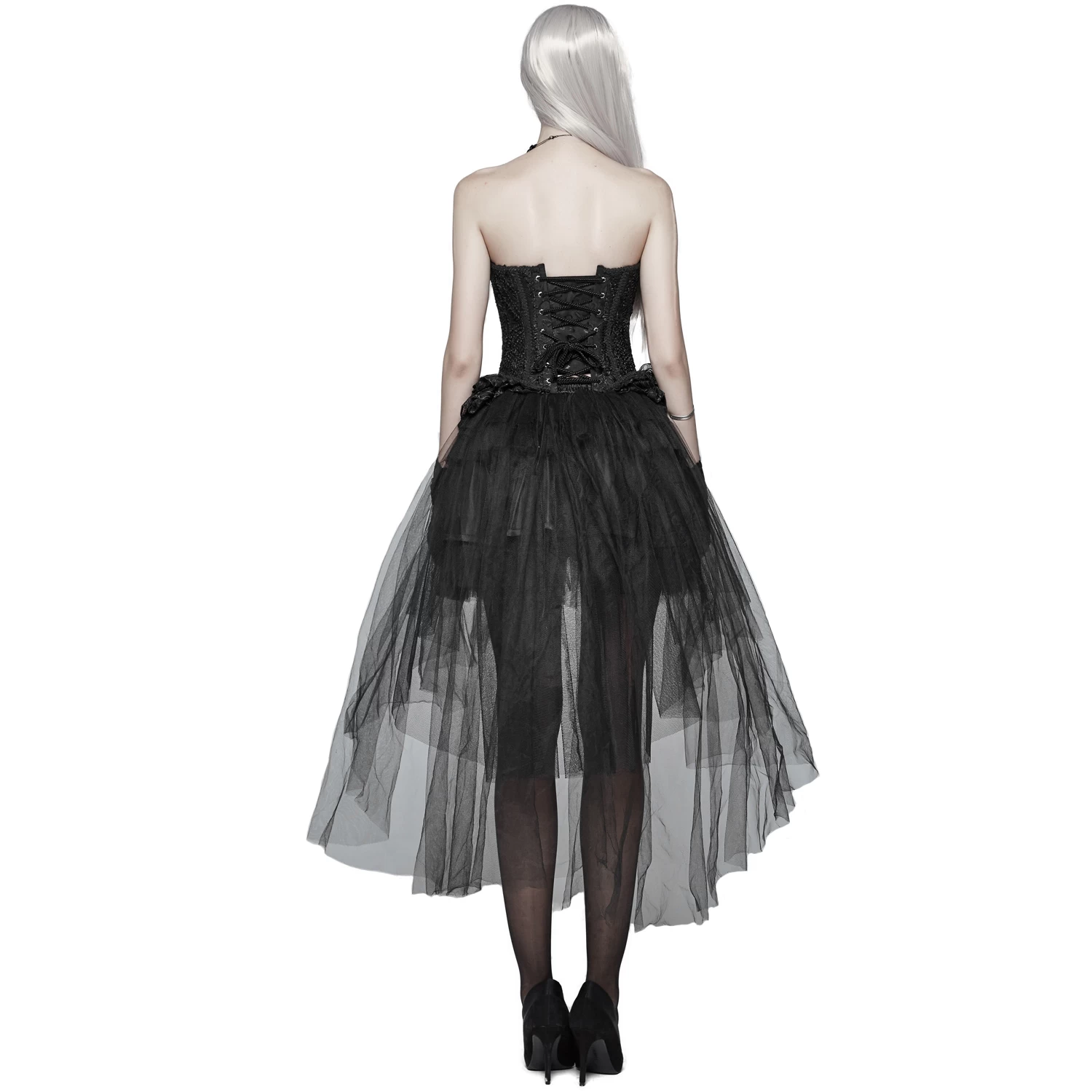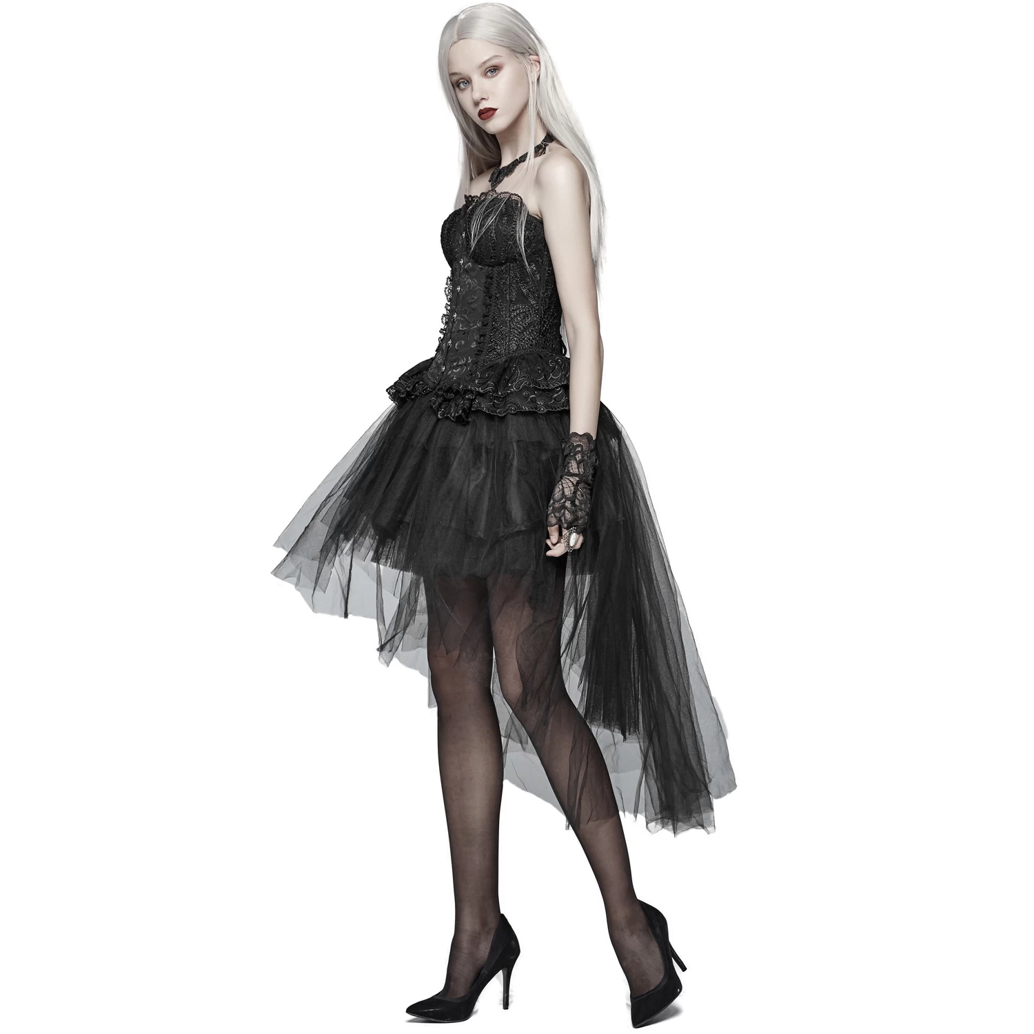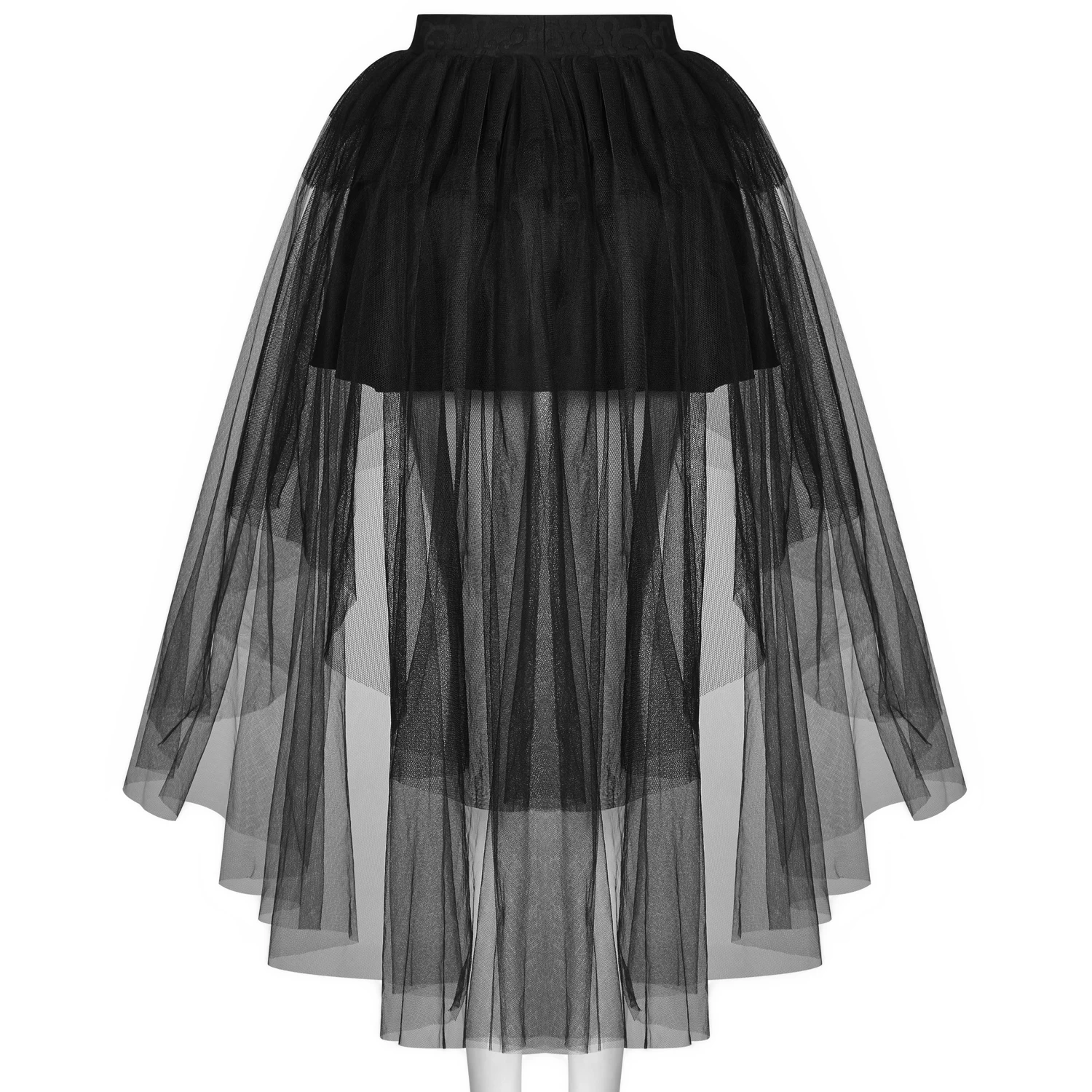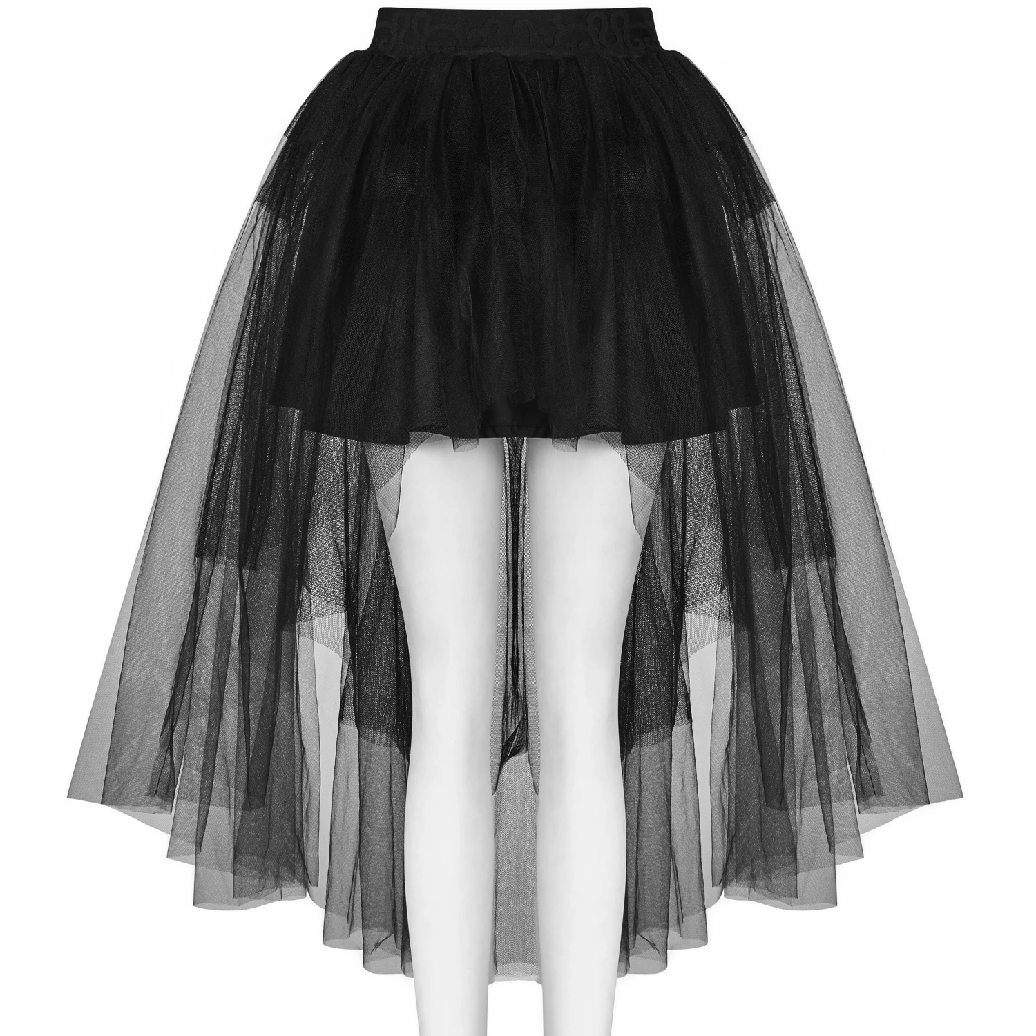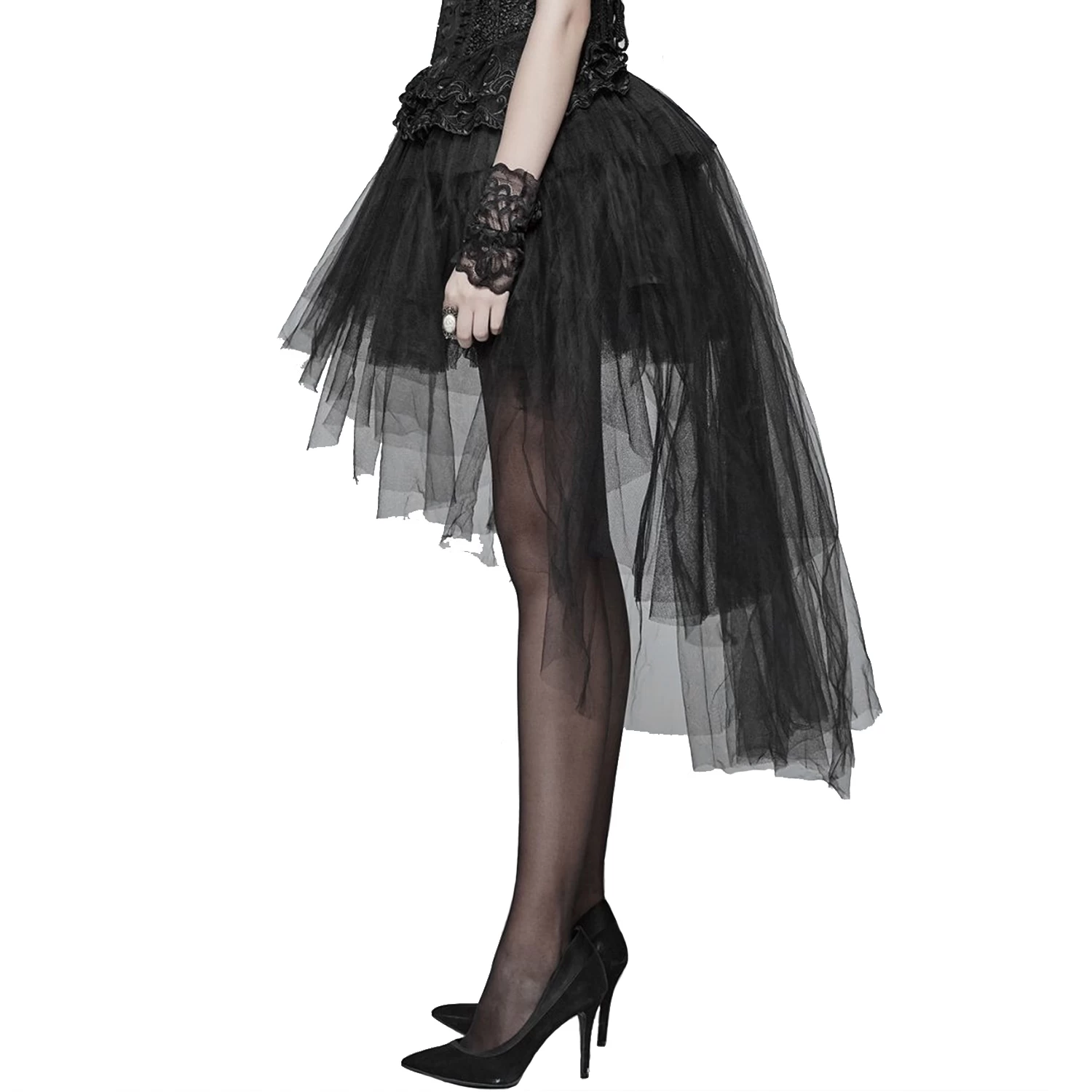 Jupe courte plissée asymétrique noire partiellement transparente, style gothique victorien.