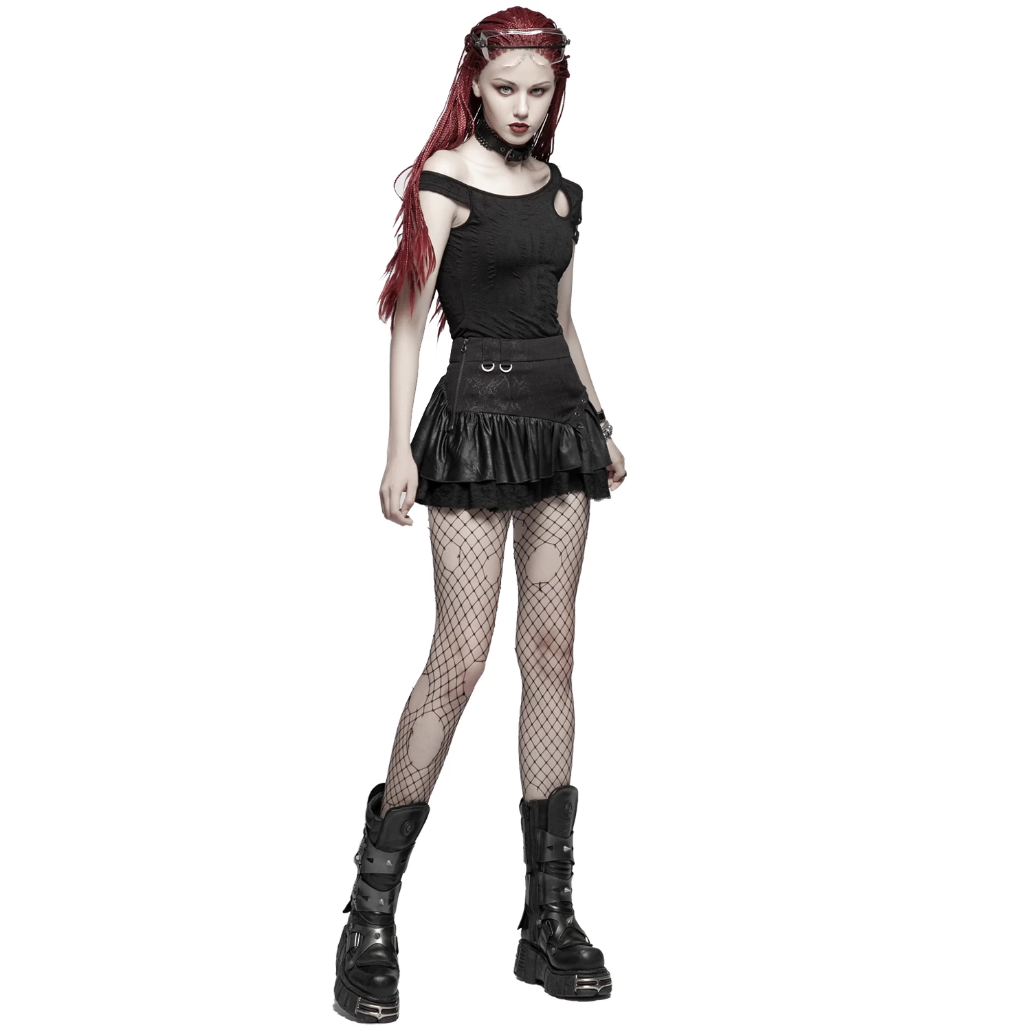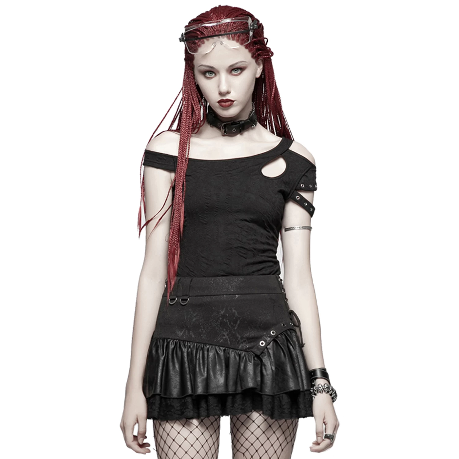 Mini-jupe noire à volants de style gothique, ornée d’un laçage sur le côté.