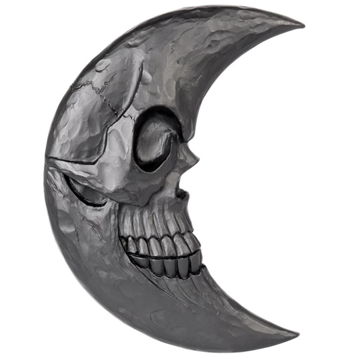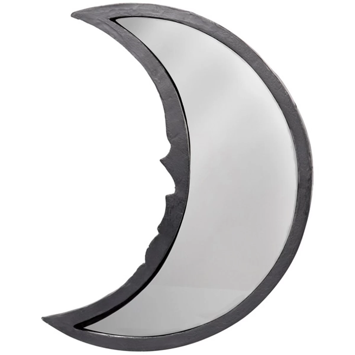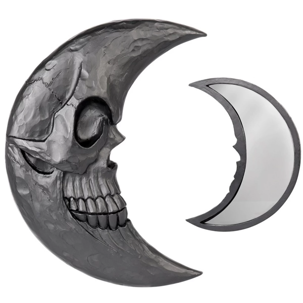 ⹠Un miroir en forme de lune avec des détails complexes de crùne, fini à la main dans une résine noire de la plus haute qualité.