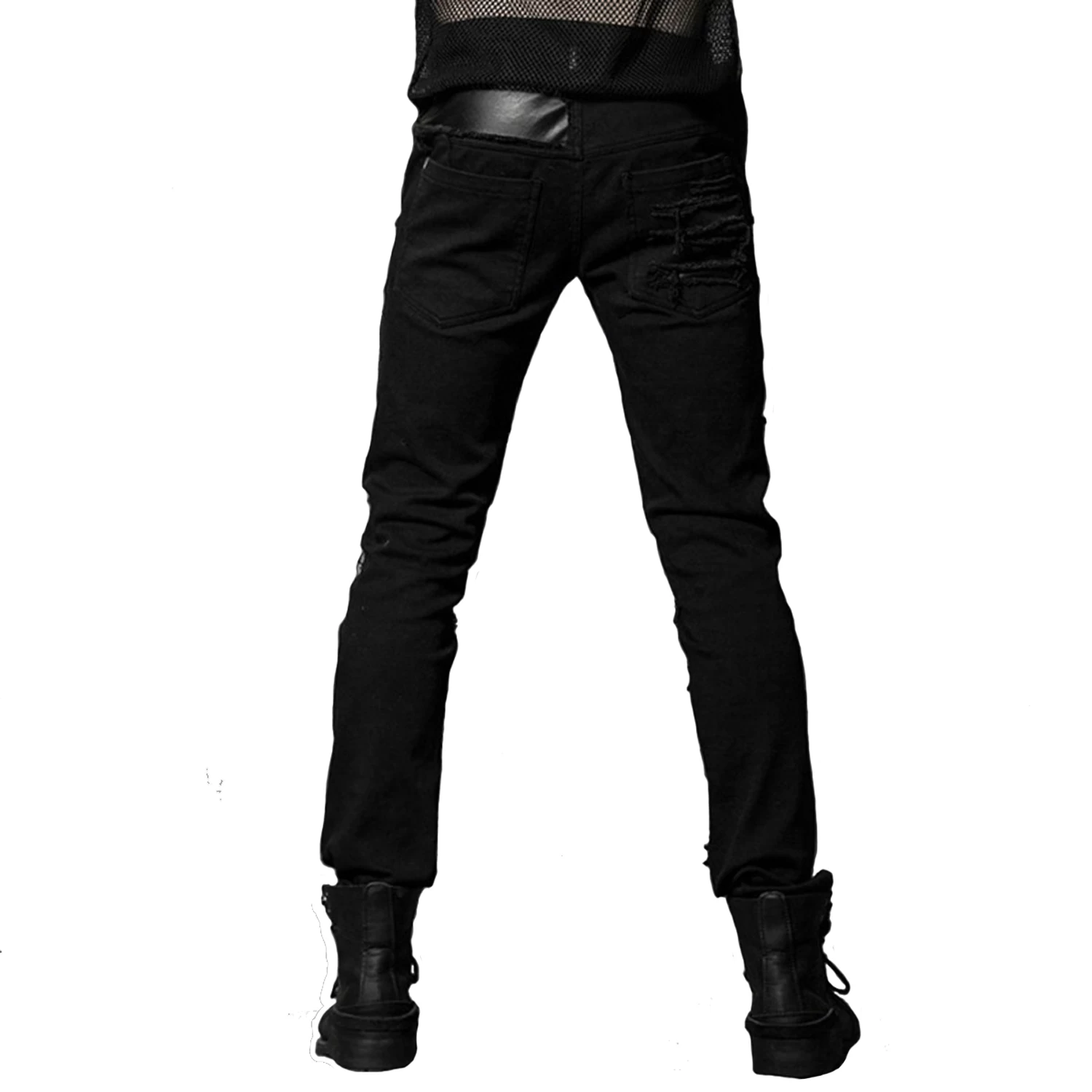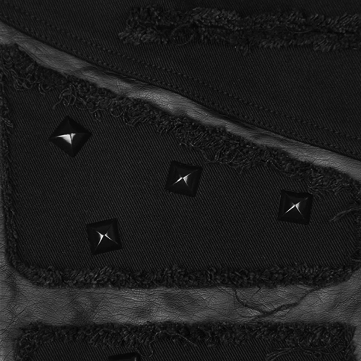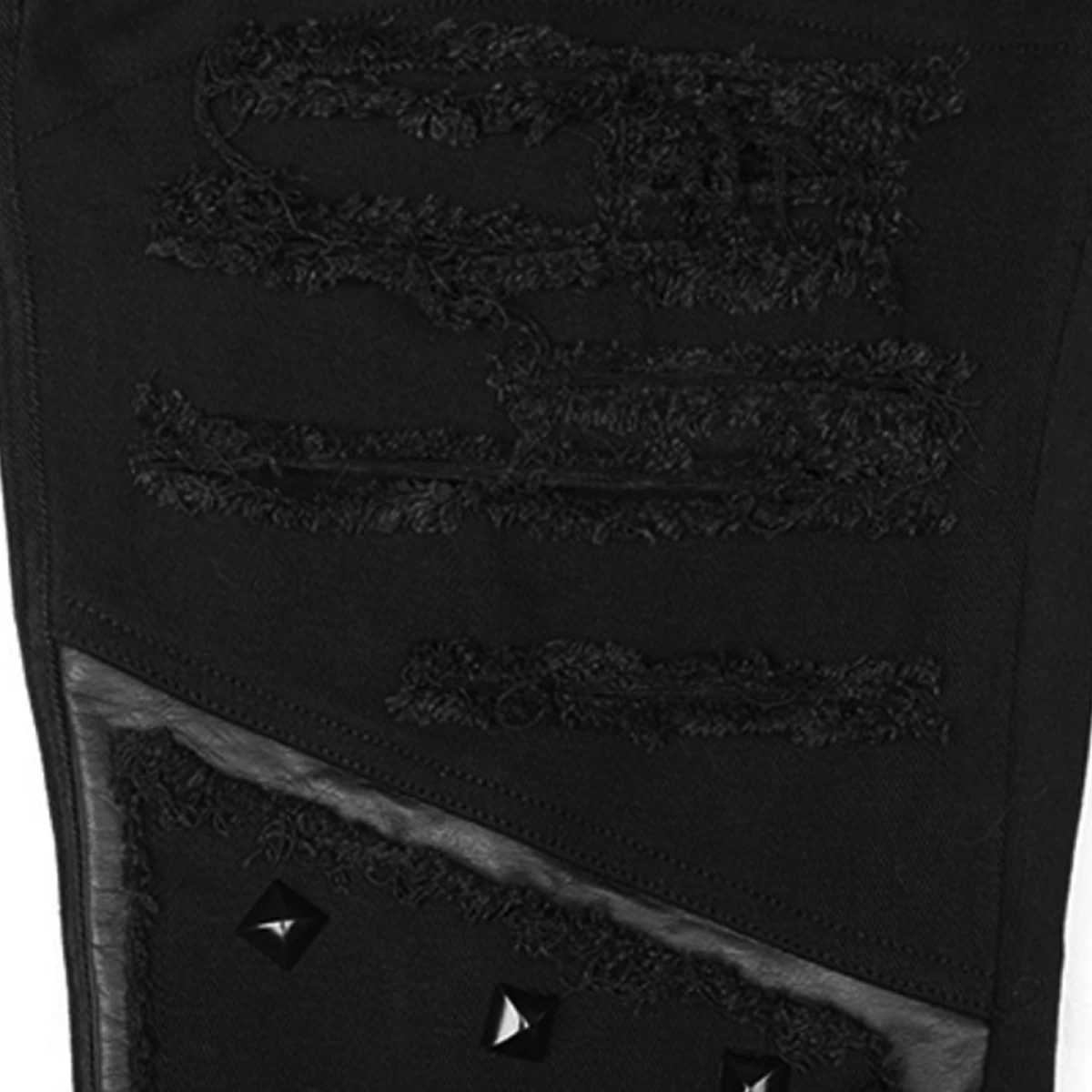 Pantalon noir pour homme gothique en tissu extensible avec détails en cuir synthétique et clous noirs.