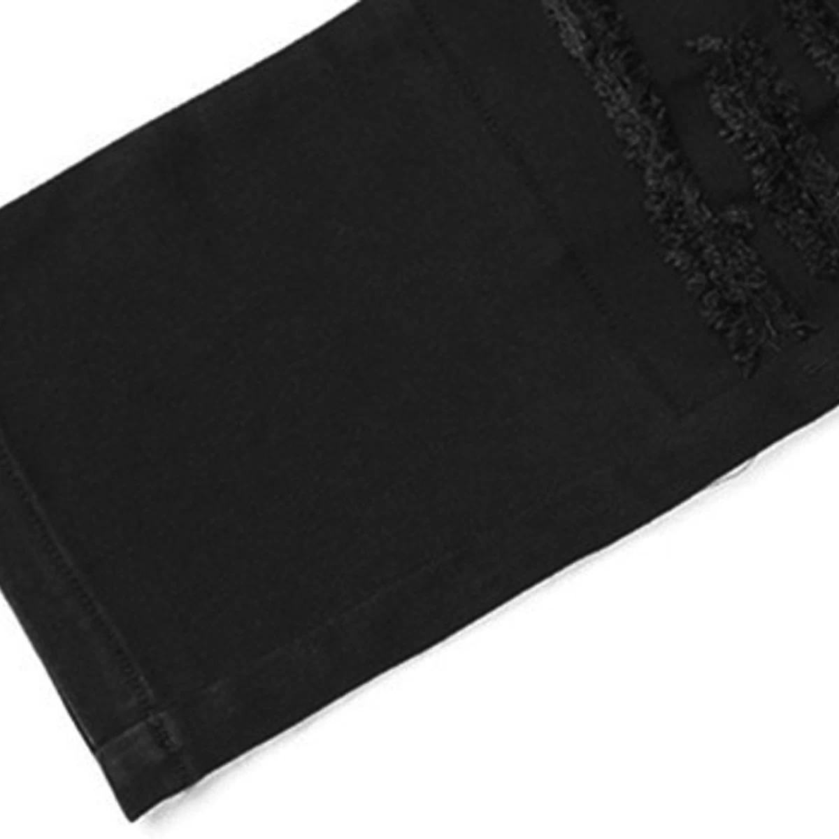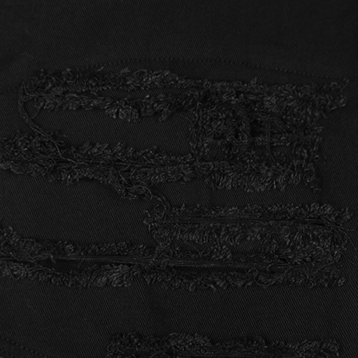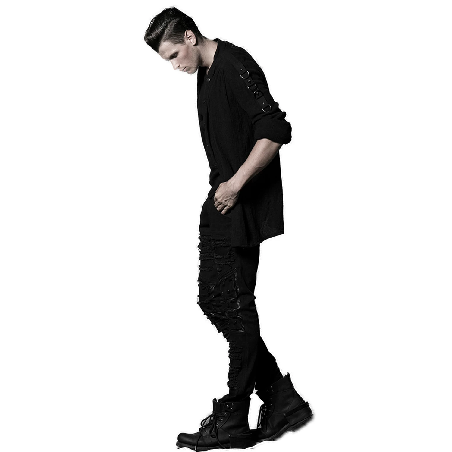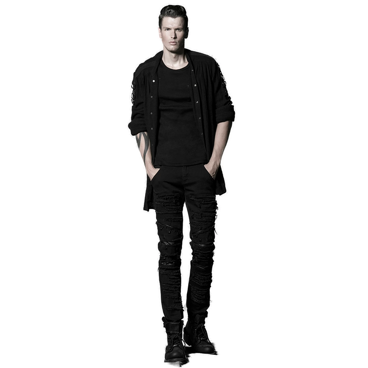 Pantalon noir pour homme gothique en tissu extensible avec détails en cuir synthétique et clous noirs.