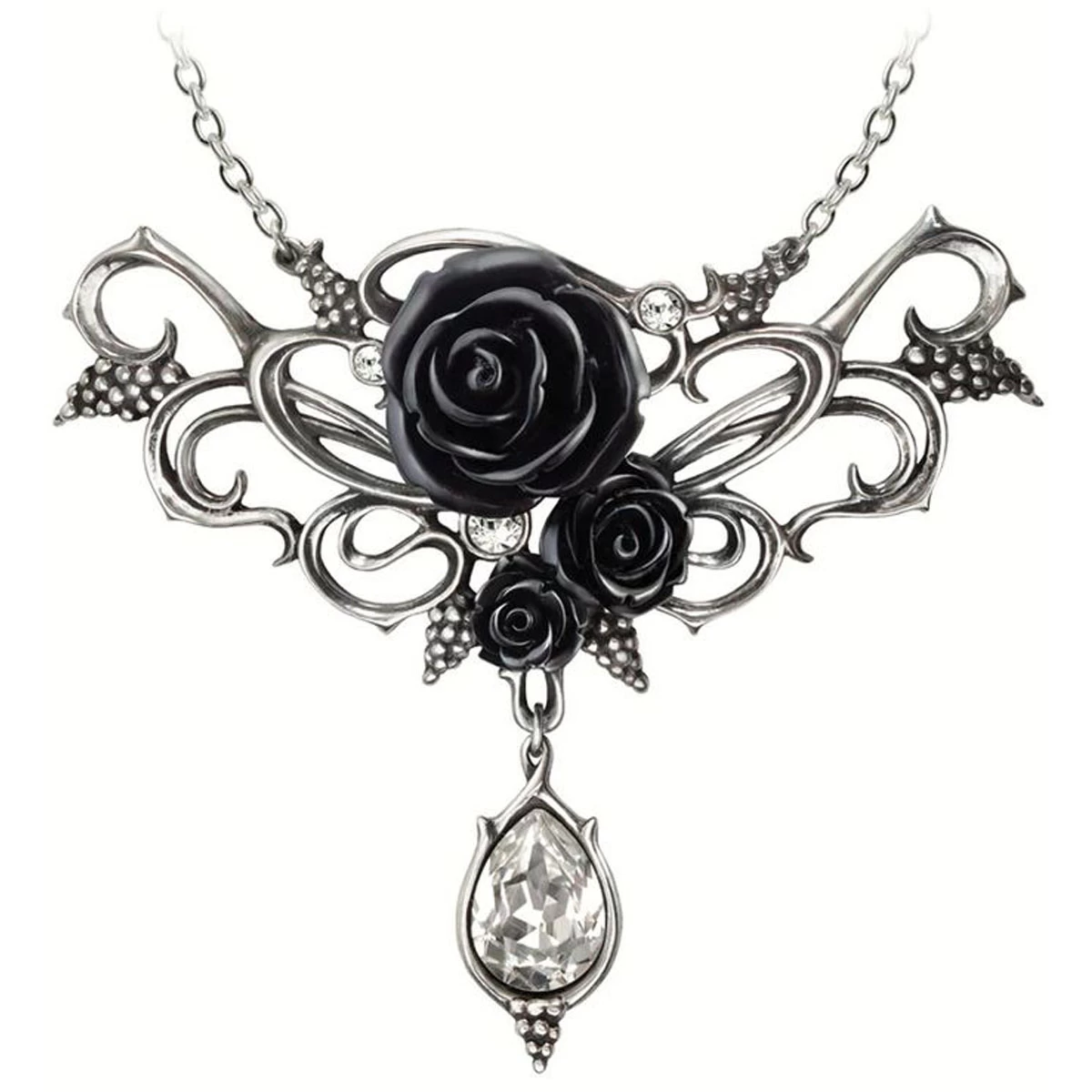 • Un collier en étain orné de vignes enchevêtrées entourant trois roses en résine noire et suspendu avec un compte-gouttes en cristal Swarovski transparent.