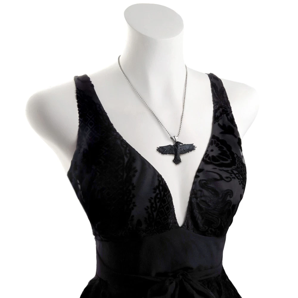 • Un pendentif en étain bicolore avec un corbeau noir suspendu à une bélière polie.