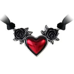 • Un motif de collier cœur en étain émaillé rouge trans à effet nacré, flanqué de part et d’autre de roses avec une fleur en acrylique noir.
