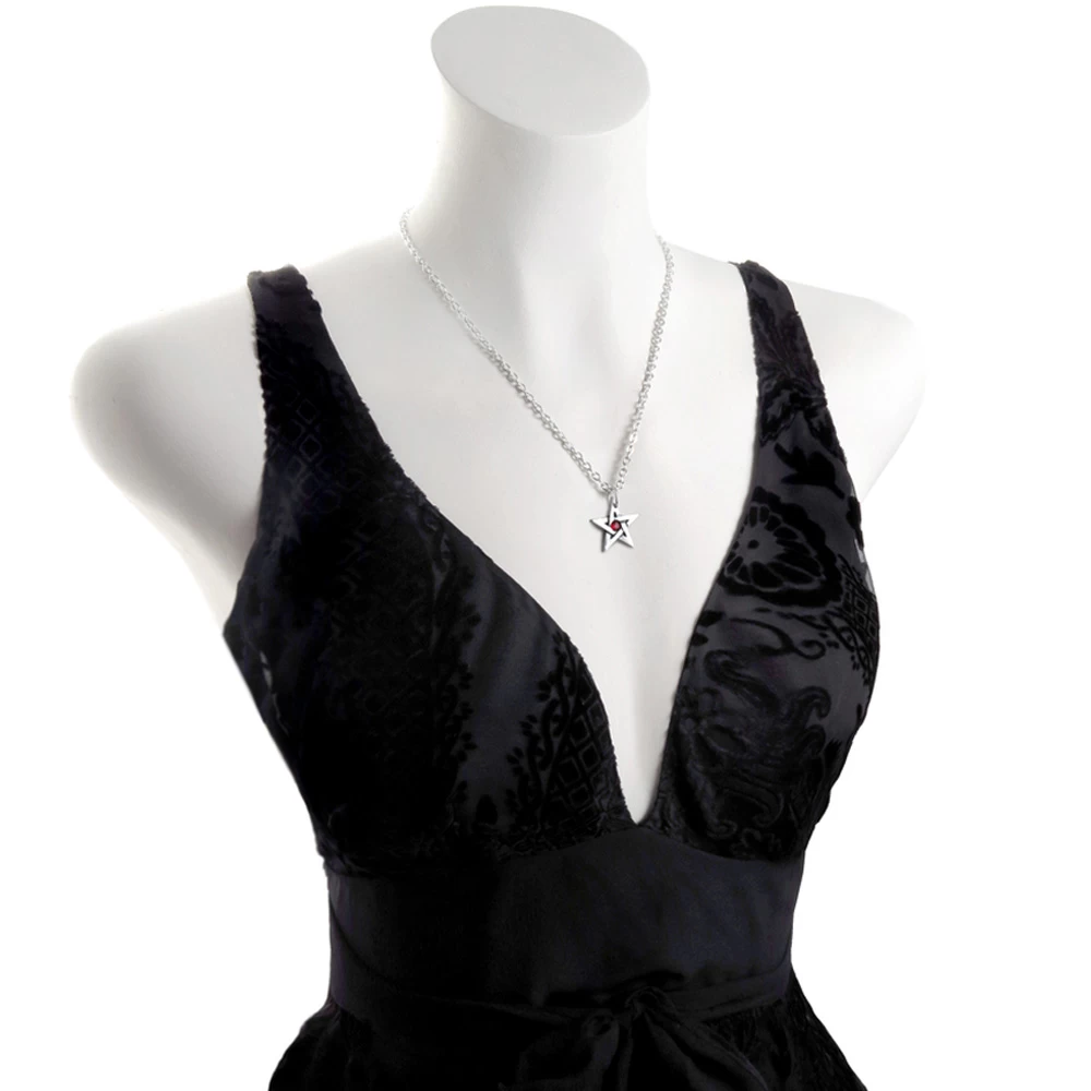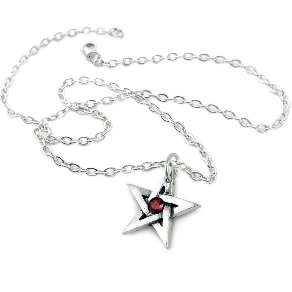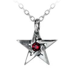 • Un petit pendentif pentagramme protecteur étincelant pour toute occasion, en étain serti d’un cristal Swarovski rouge.