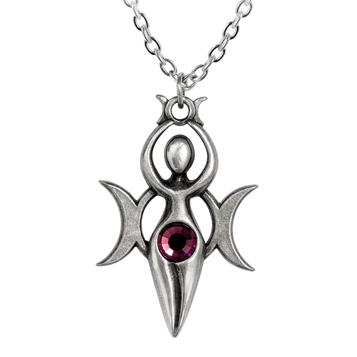 • Une triple Lune, Symbole de la Déesse parfaitement réalisée à la main en étain fin anglais. Rehaussé d’un magnifique cristal d’améthyste magique d’Autriche.