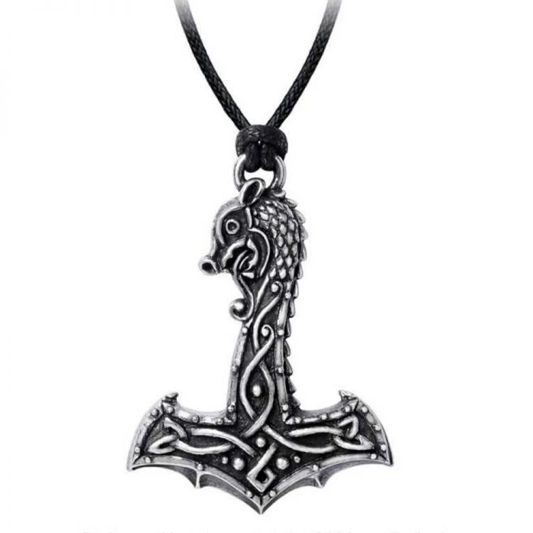 âą Un pendentif marteau Viking en Ă©tain vieilli de 56 mm de long avec entrelacs celtiques sculptĂ©s et tĂȘte de dragon.