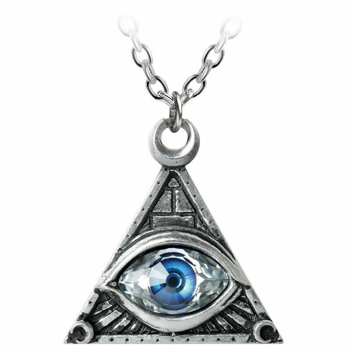 • Un triangle pyramidal en étain serti d’un œil en cristal Swarovski à pupille bleu vif.