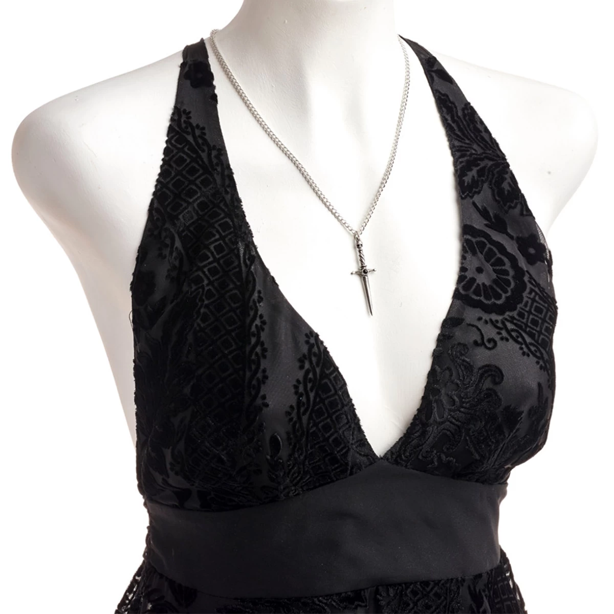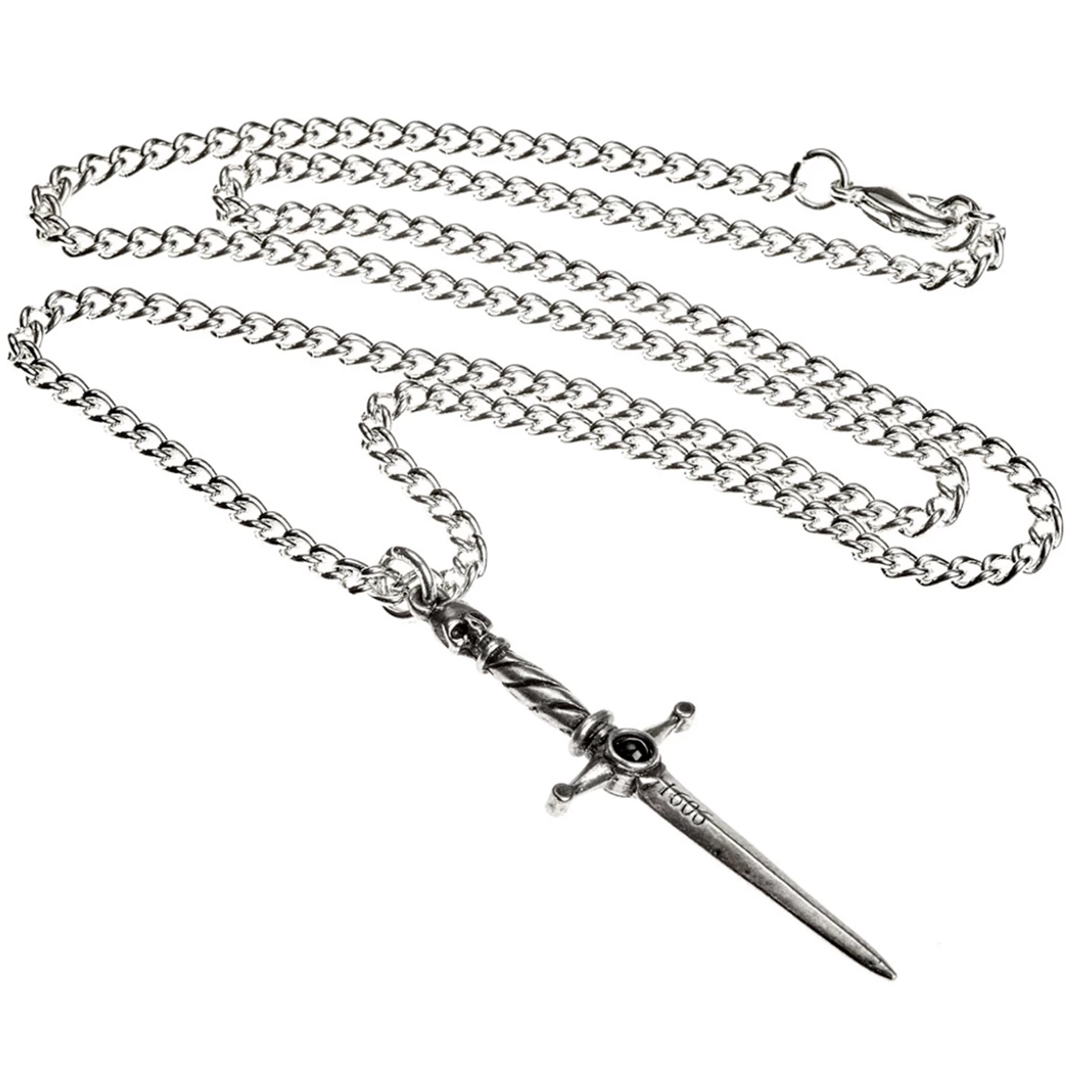 • Un petit pendentif en étain d’un poignard de style médiéval avec un petit cabochon noir sur la garde et une lame gravée.