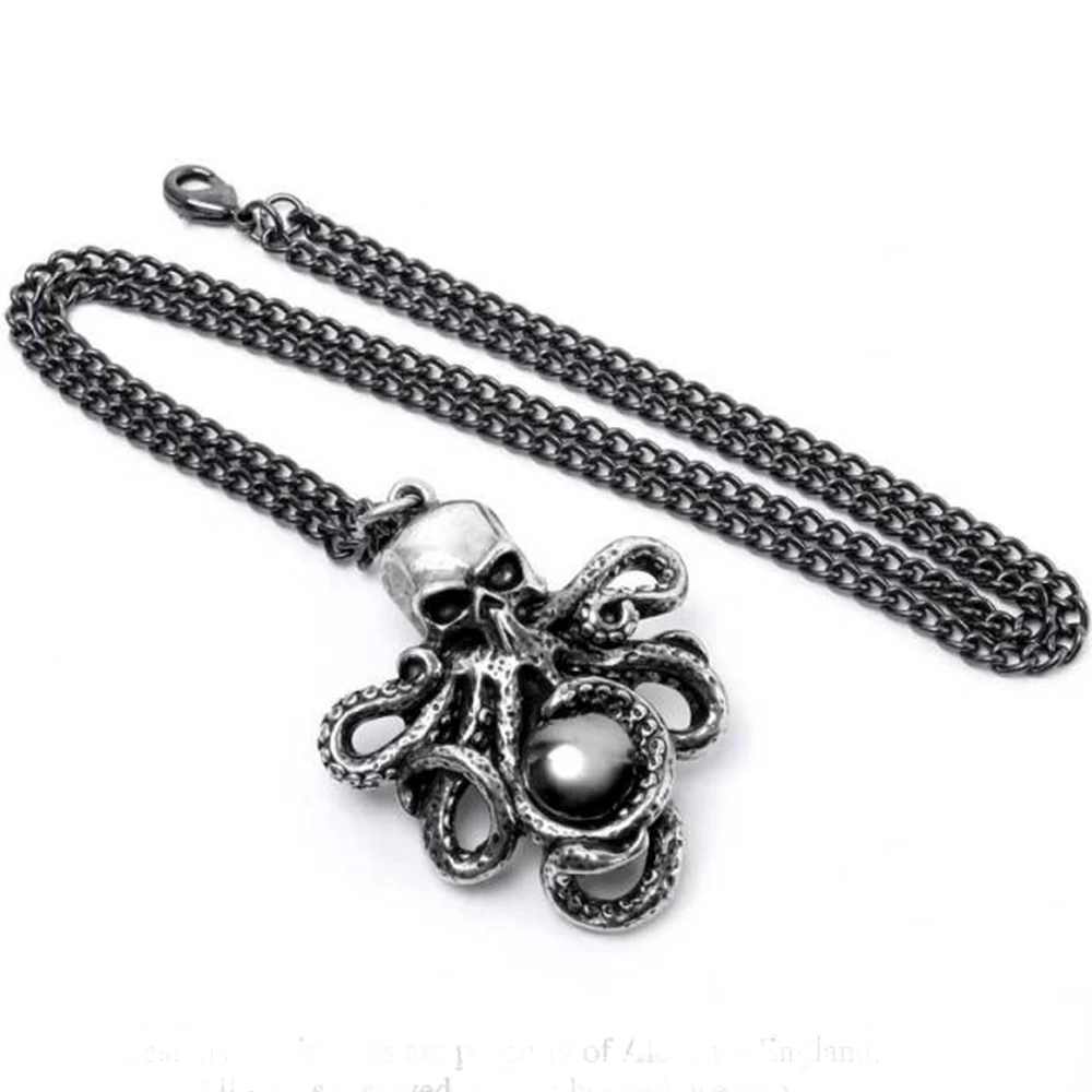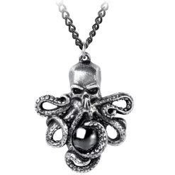 • Un pendentif pieuvre en étain au corps en forme de crâne humain, et enserrant dans ses tentacules un cabochon en graphite noir.