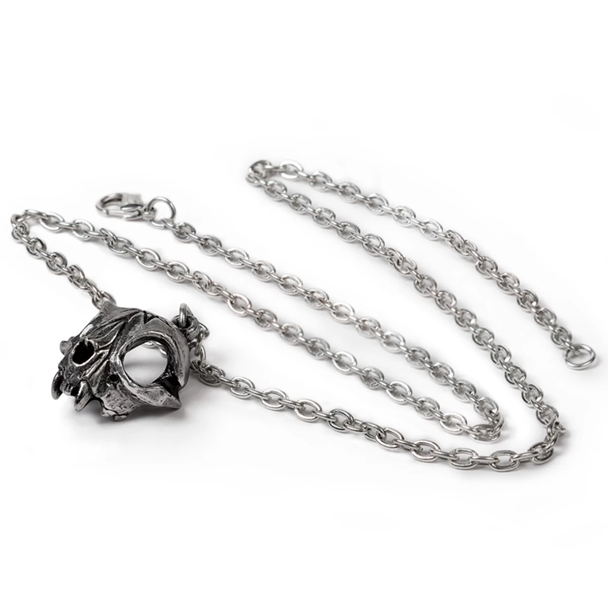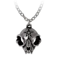 • Un collier de crâne de chat poli avec un symbole pentagramme gravé.
