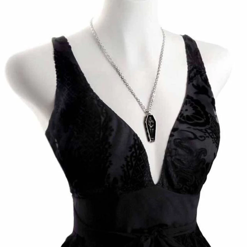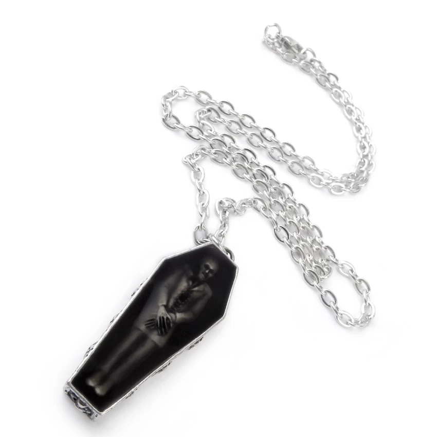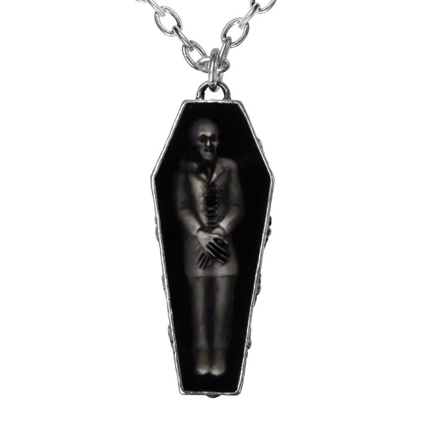 • Pendentif en forme de cercueil en étain contenant une figurine en résine blanche, fantôme de Nosferatu, sous un émail fumé translucide.