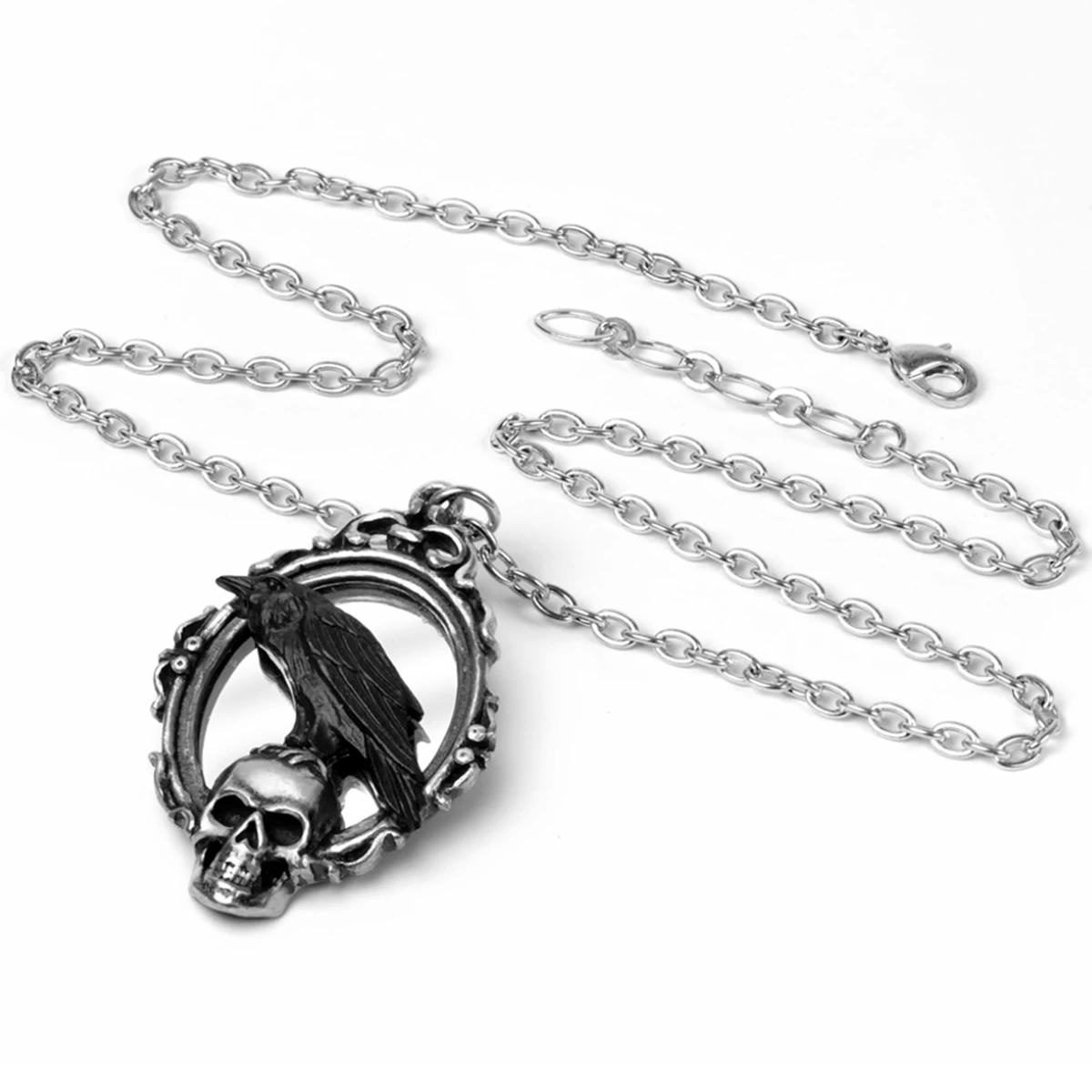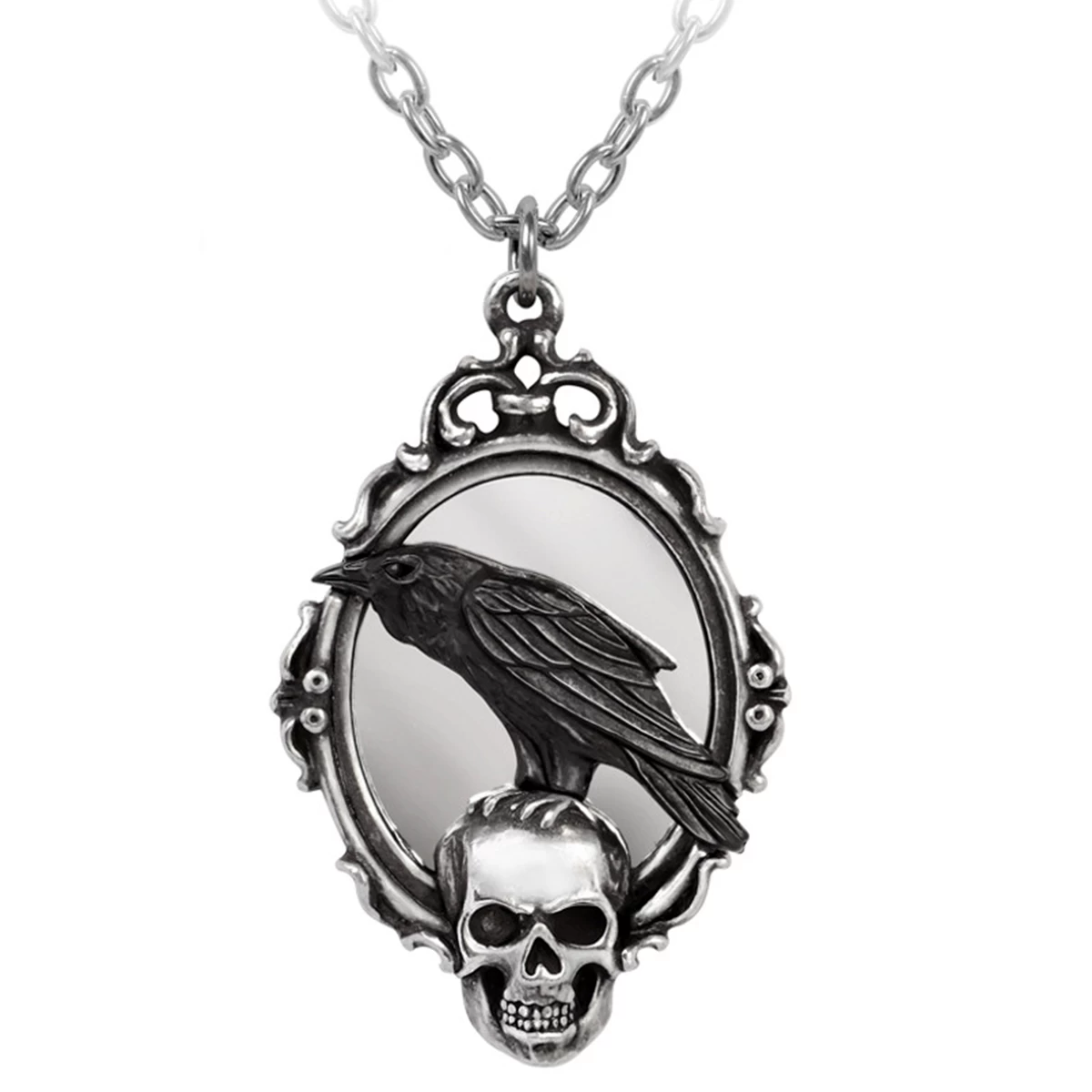 âą Un magnifique pendentif miroir avec un cadre ornĂ© d’un crĂąne poli. IncrustĂ© d’un corbeau noir de jais contrastant et sur une chaĂźne fendue de 46 cm au total, plus une chaĂźne d’extension de 3,8 mm.