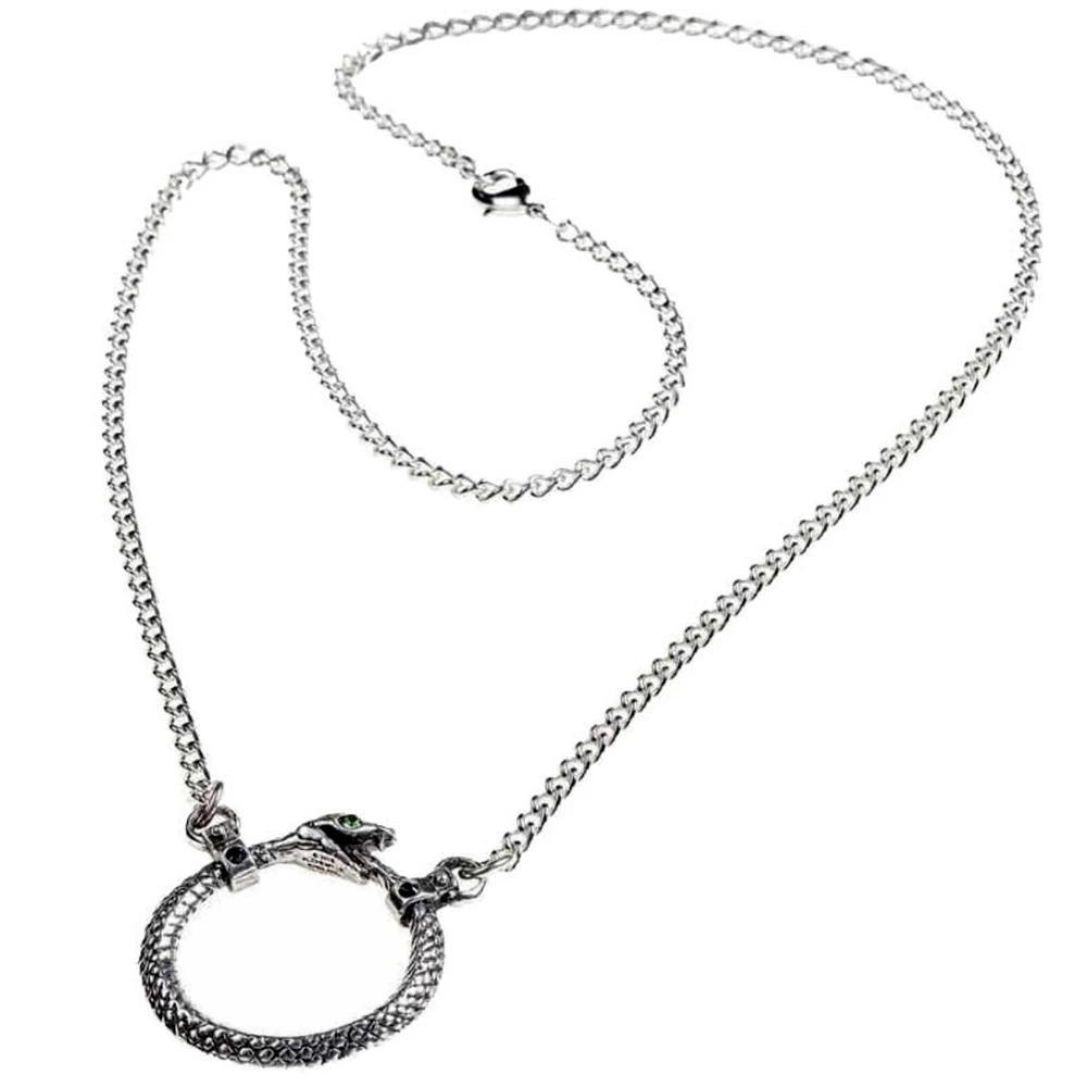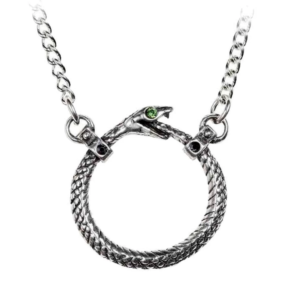 âą Un pendentif serpent d’Ă©ternitĂ© en Ă©tain avec un Ćil en cristal Swarovski vert.
