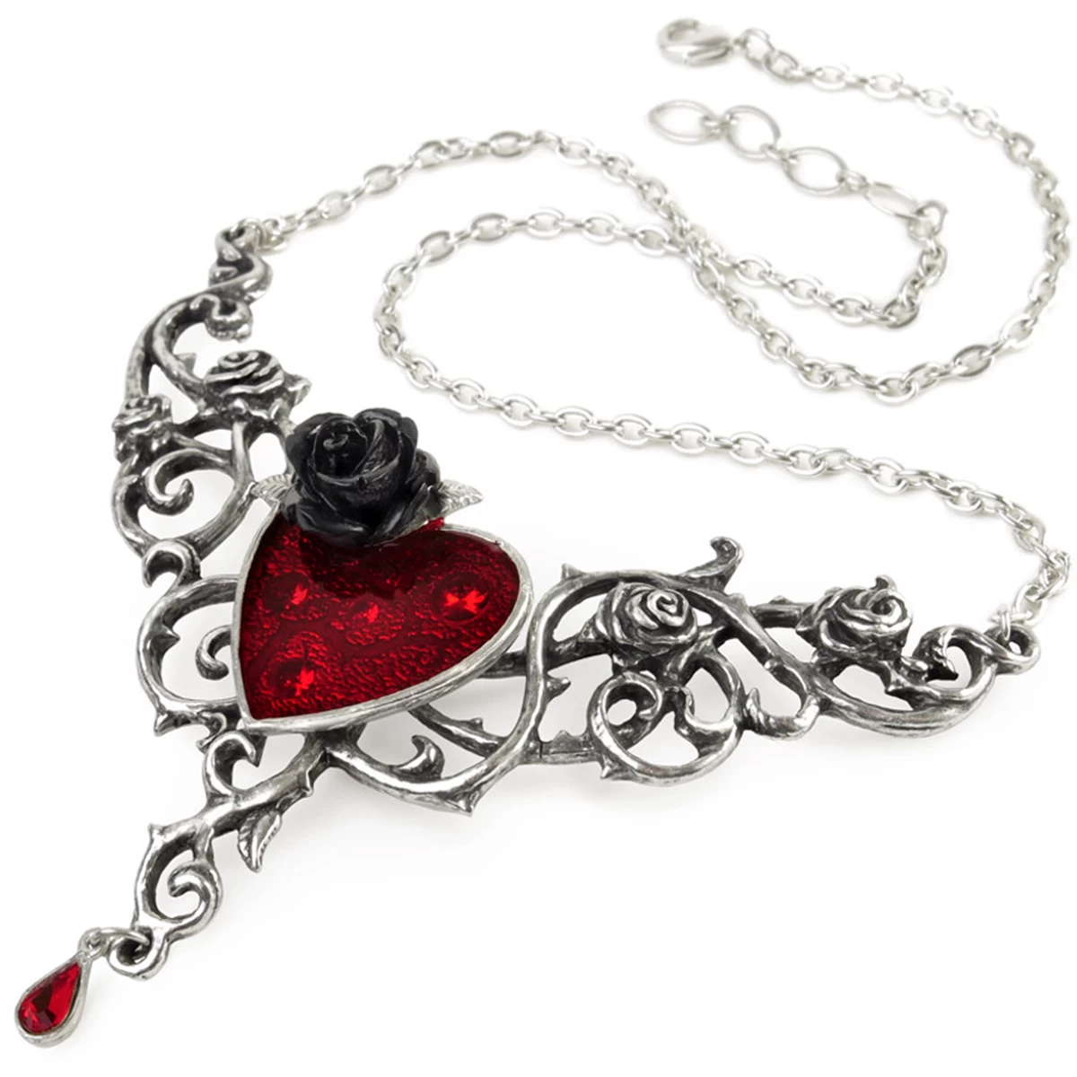 • Un pendentif en étain orné d’épines de rose enchevêtrées entourant un cœur émaillé rouge transparent, serti en dessous de cristaux autrichiens et surmonté d’une rose noire et terminé par un compte-gouttes en cristal rouge sang.