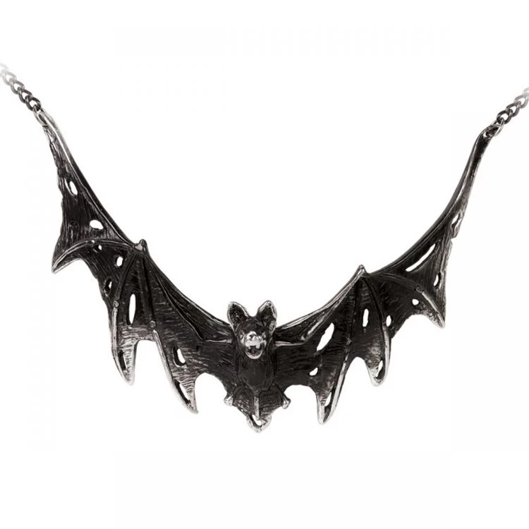 • Un pendentif en étain foncé délavé d’une chauve-souris en lambeaux, écartée et plongeant.