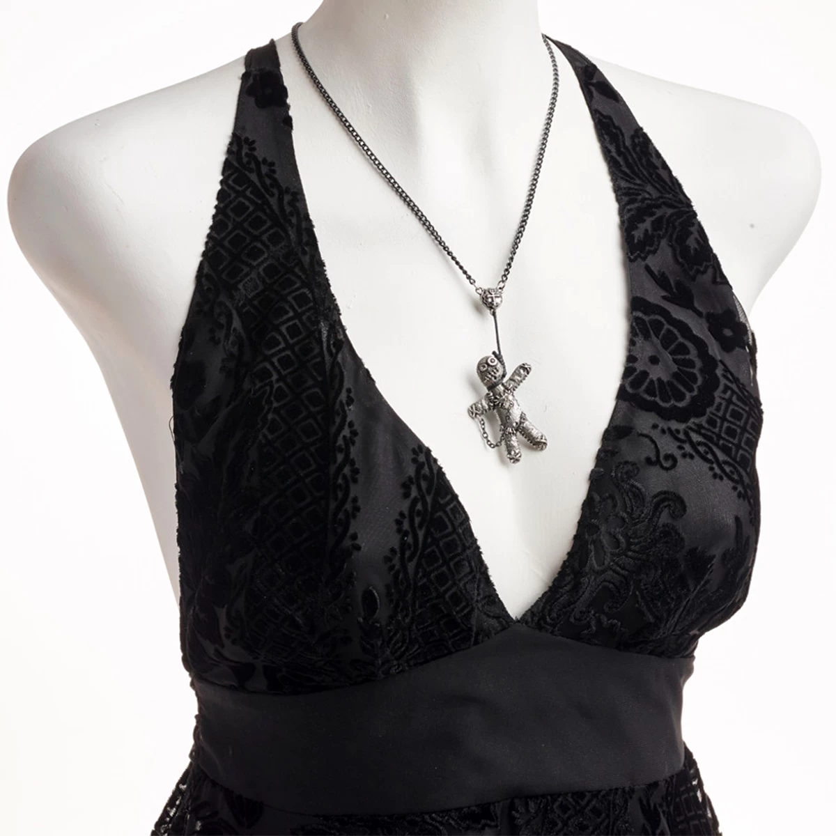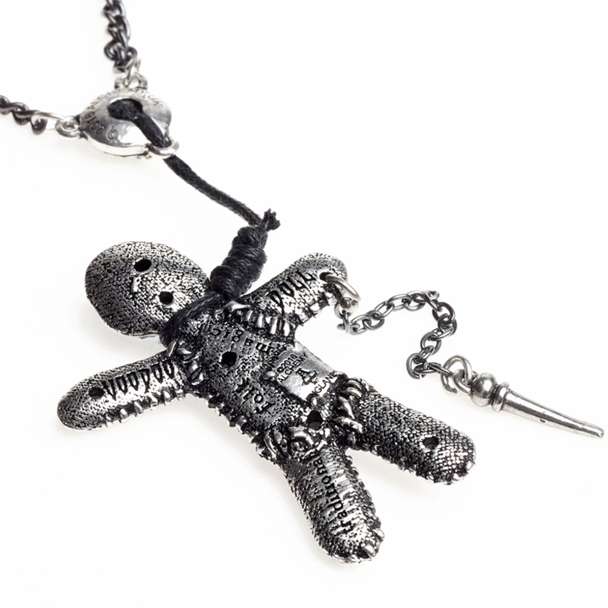 âą Un pendentif en Ă©tain vieilli d’une poupĂ©e vaudou avec des trous de cheville aux six principaux points du corps (Ćil/tĂȘte, bouche, cĆur/poumons, aine/estomac, main et pied), avec une courte longueur de chaĂźne noire Ă partir de la droite main tenant une cheville avec laquelle coller la poupĂ©e.