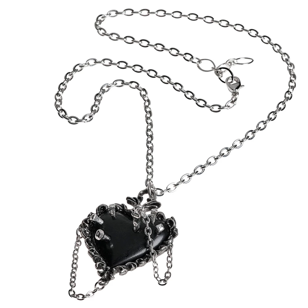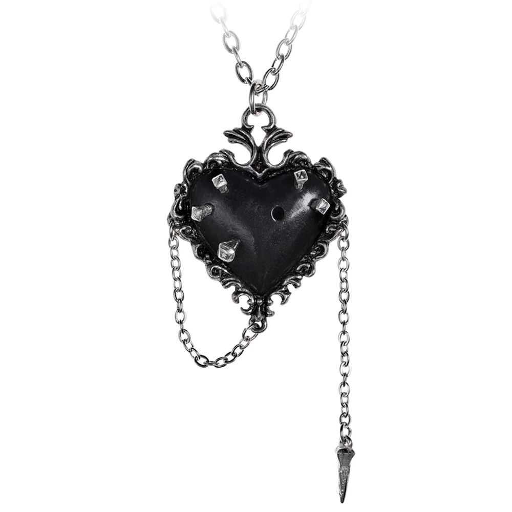 âą Un pendentif rn forme de cĆur en Ă©tain noir dans un cadre en Ă©tain fin et dĂ©coratif, le cĆur Ă©pinglĂ© avec cinq clous en Ă©tain avec un sixiĂšme lĂąche sur une chaĂźne, qui peut ĂȘtre enfoncĂ© dans le trou vacant.